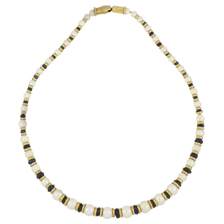 Girocollo in oro giallo perle scalari e tanzaniti con particolare chiusura a tubetto.