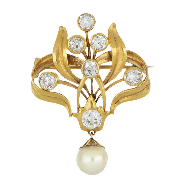 Spilla Liberty in oro giallo 7 diamanti taglio antico per stimati ct 2 5 perla di acqua salata pendente di 9 mm di diametro.