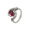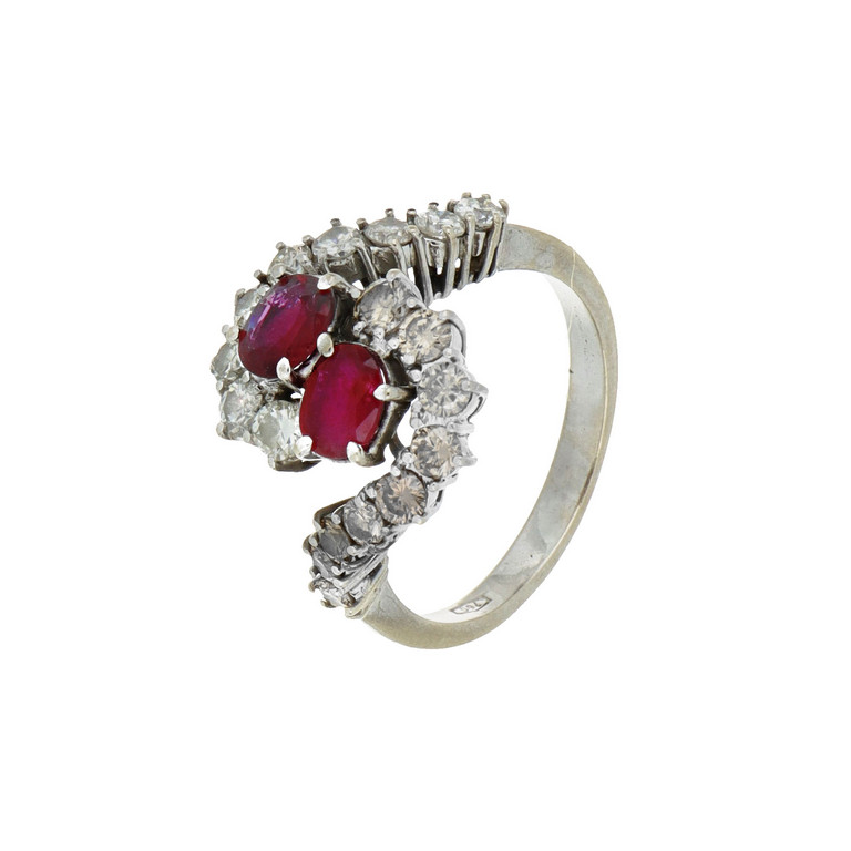 Anello a contrarie' di due rubini ovali contornati da diamanti taglio brillante fancy brown e bianchi per complessivi ct 0 80 ca.