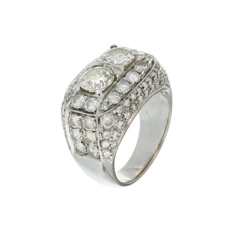 Anello in oro bianco a fascia squadrata con al centro due diamanti taglio vecchia Europa per stimati ct 2 0 complessivi e altri a ricoprire la fascia taglio brillante per complessivi ct 1 80 ca.