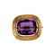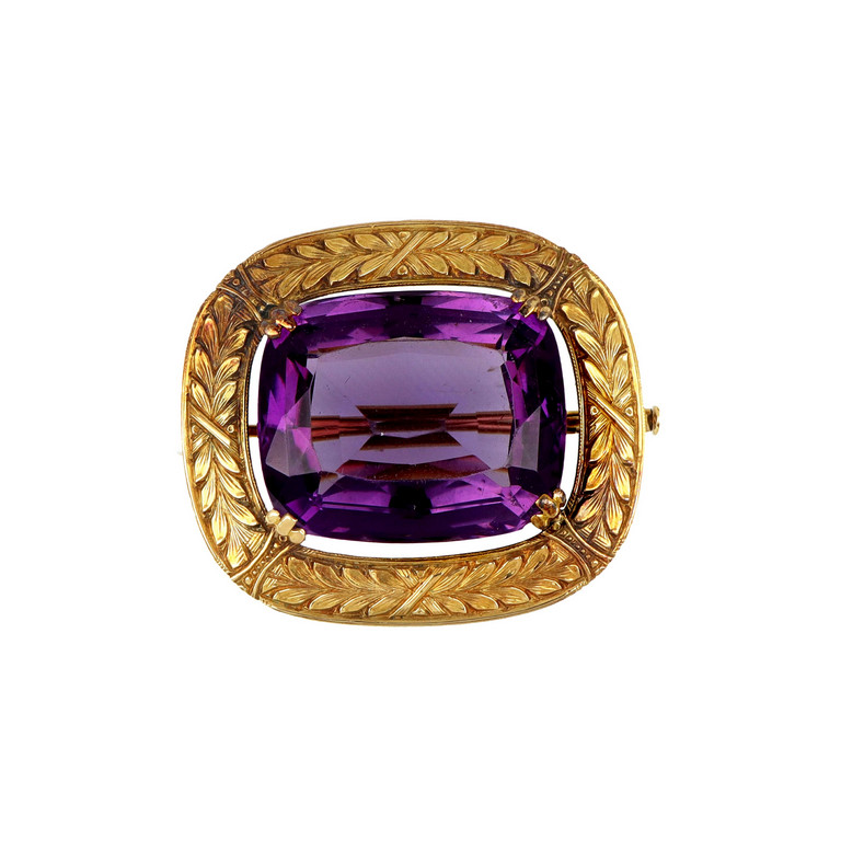 Spilla in oro giallo con grande ametista lavorata a foglie di alloro.