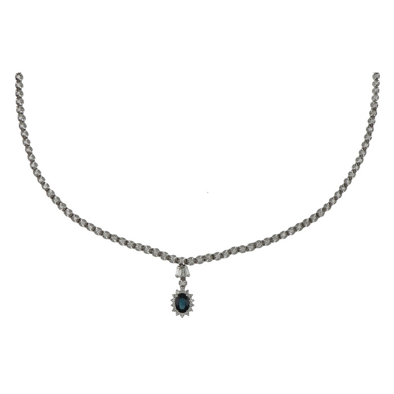 Girocollo in oro bianco con pendente diamanti a tutto giro taglio taper e taglio brillante per ct 1 50 ca. zaffiro di ct 1 50 ca.