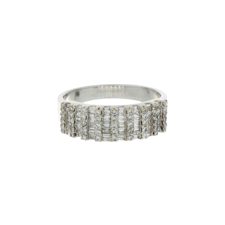 Anello in oro bianco a fascia con diamanti taglio brillante e baguette per ct 0 80 ca.