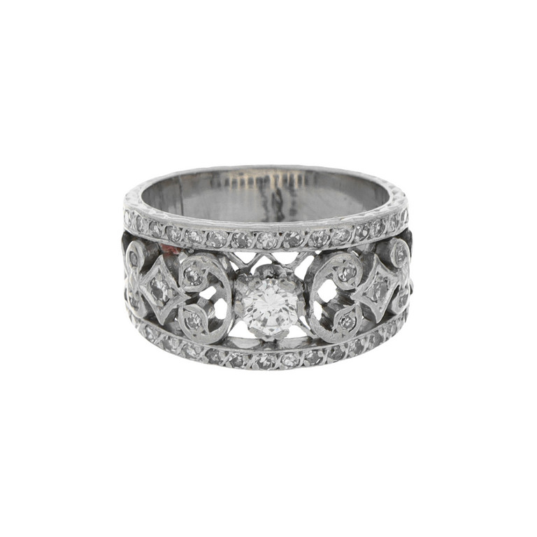 Anello in platino a fascia diamanti taglio 8/8 e brillante nella parte superiore ct 0 60 ca. decorata con incisioni sul gambo.