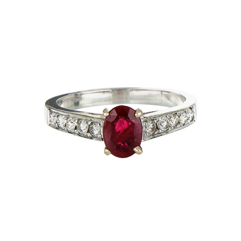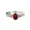Anello in oro bianco con rubino centrale taglio ovale di ct 0 70 ca e diamanti taglio brillante per ct 0 30 ca sul gambo di forma squadrata.