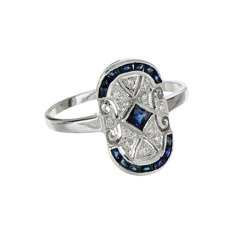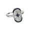 Anello in oro bianco stile antico di forma ovale piccoli zaffiri e diamanti.