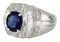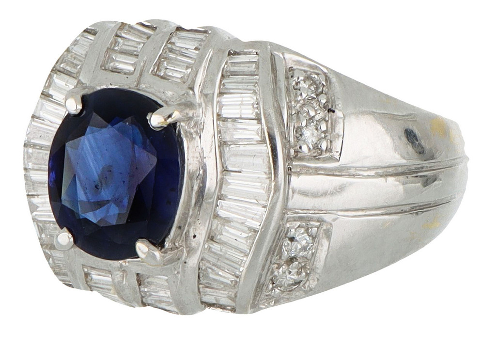 Anello a fascia in oro bianco con zaffiro blu centrale taglio ovale di ct 2 17 e diamanti vario taglio per ct 1 35 ca.