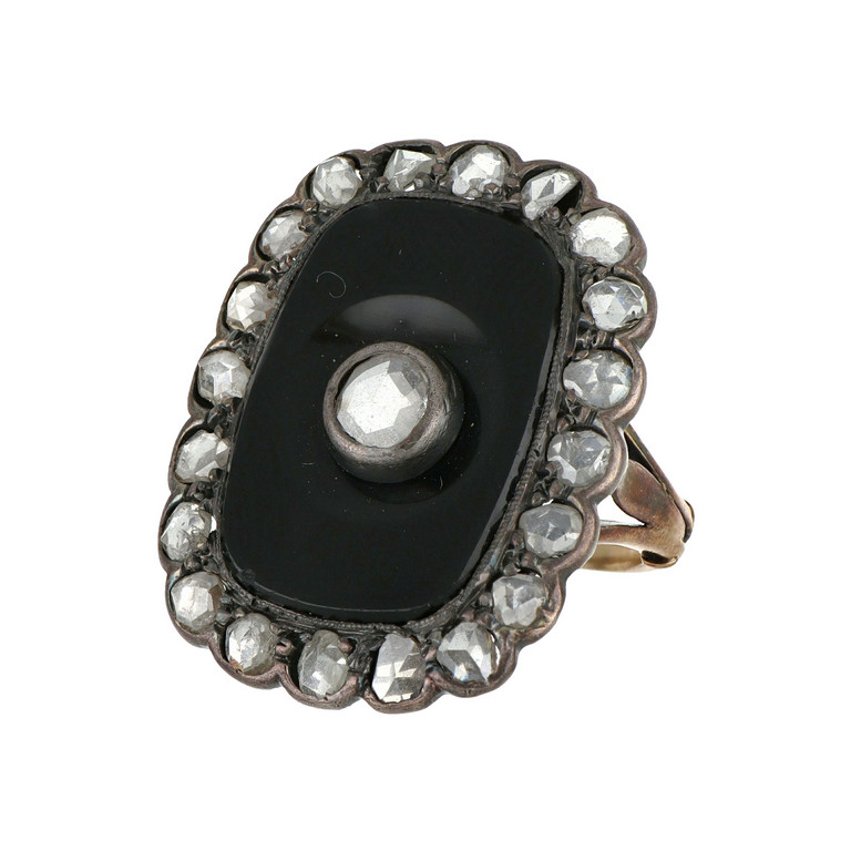 Anello antico in oro rosso e argento caratterizzato da grande onice taglio cuscino contornato da diamanti taglio rosa uno al centro.