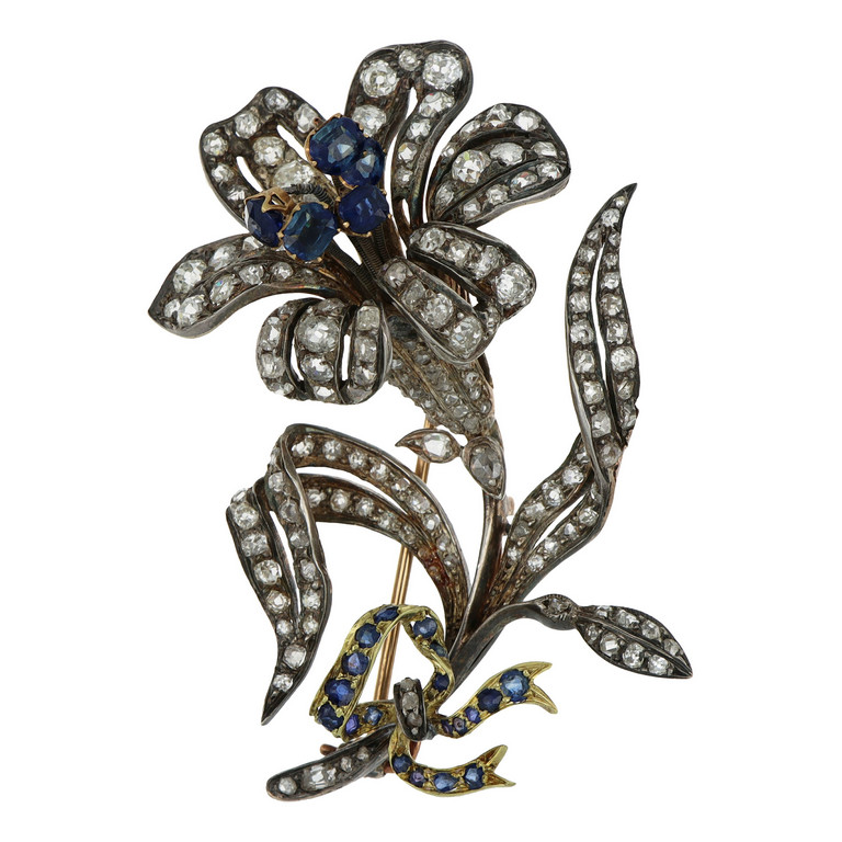 Spilla di antica manifattura in oro rosso giallo e argento a forma di grande fiore con pistilli in zaffiri e interamente tempestata di diamanti di taglio antico per ct 7 00 ca.