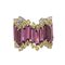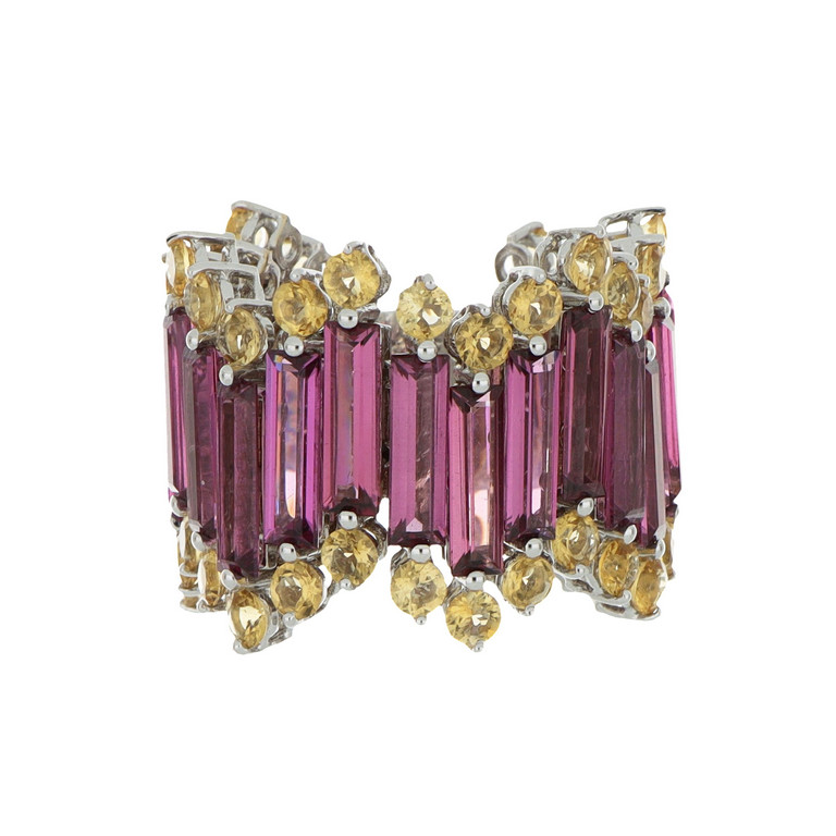 Anello cocktail in oro bianco e pietre semipreziose realizzato a tutto giro con particolare lavorazione morbida lunghe baguette di rodoliti ct 15 06 sono sormontate da quarzi citrini rotondi ct 3 93.