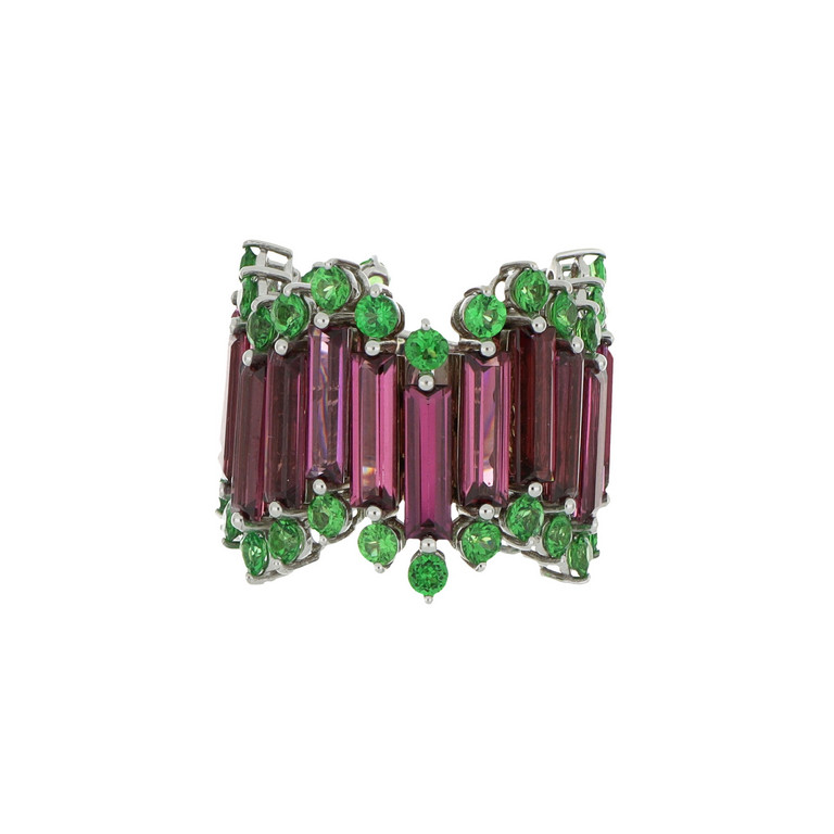 Anello cocktail in oro bianco e pietre semipreziose realizzato a tutto giro con particolare lavorazione morbida lunghe baguette di rodoliti ct 14 46 sono sormontate da tzavoriti rotondi ct 3 60.