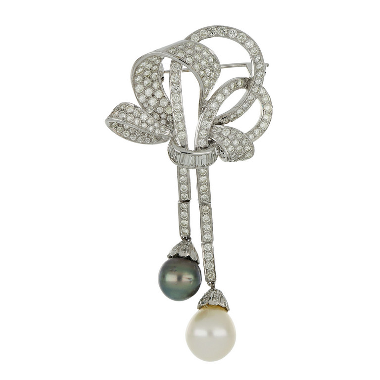 Spilla in platino a forma di fiocco interamente tempestata di diamanti taglio brillante per ct 6 5 ca a terminare due perle coltivate pendenti una bianca di 14 mm e una grigia di 11 mm di diametro.