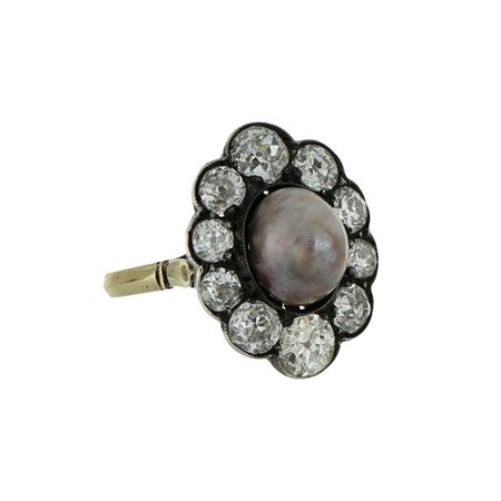 Anello di antica fattura in oro giallo e platino al centro perla grigia naturale di acqua salata di 9 x 8 mm ca a contorno 10 diamanti di taglio antico per complessivi ct 3 00 ca.