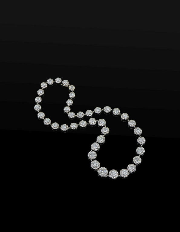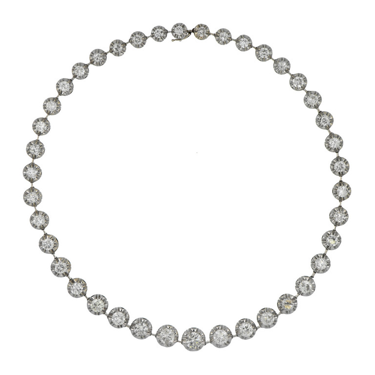 Elegante collana in platino a riviere con 40 castoni sgriffati scalari intercalati da piccole barrette sormontati da diamanti taglio brillante per complessivi stimati ct 19.