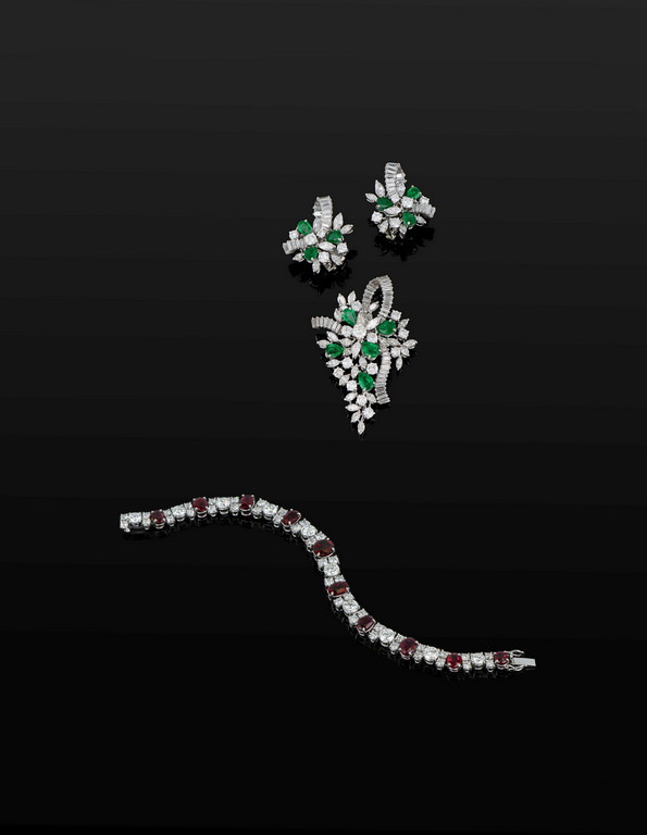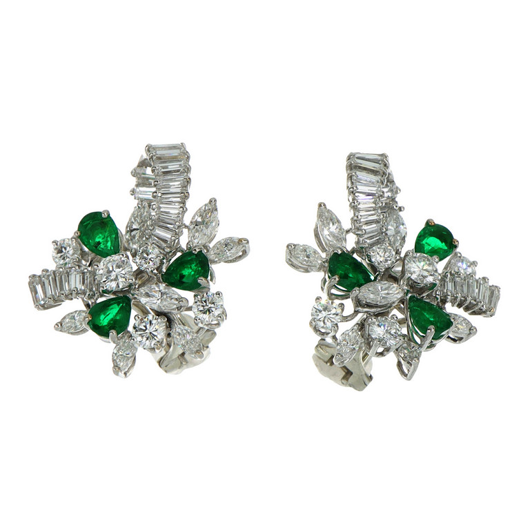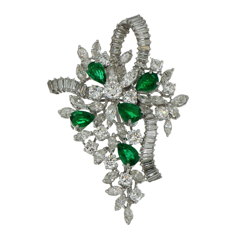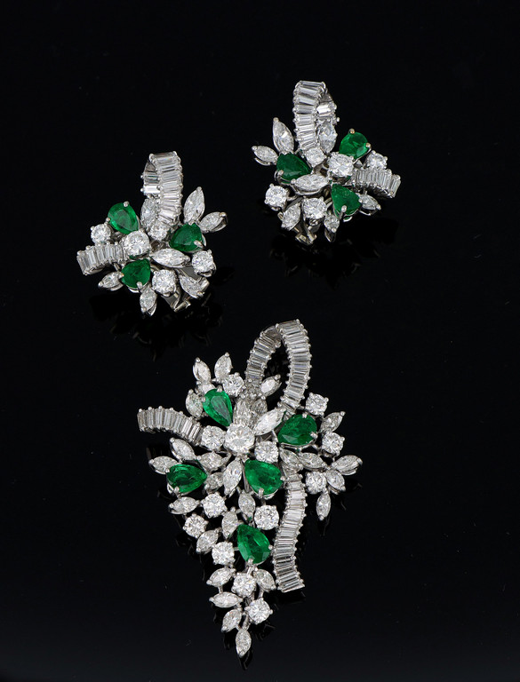 Demi parure composta da orecchini e spilla in platino di foggia fantasia con diamanti taglio baguette navette e brillante per stimati complessivi ct 12 smeraldi a goccia per ct.2 0 ca.