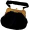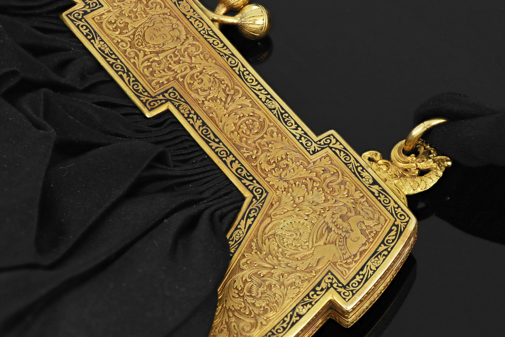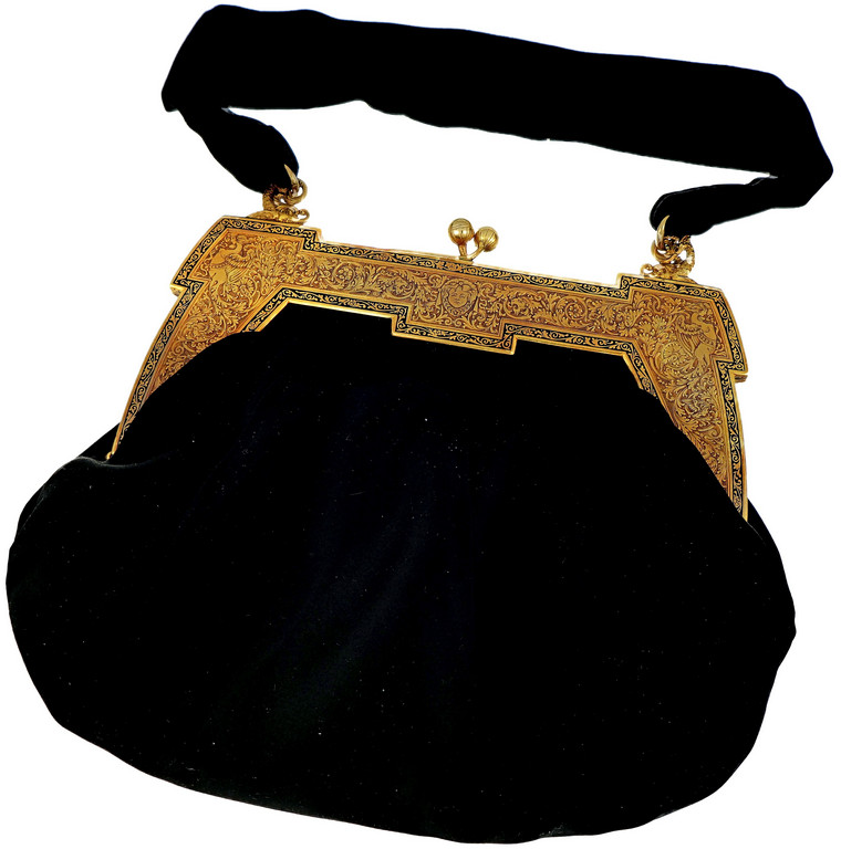 Elegante borsetta da sera in seta e oro giallo finemente incisa a motivi floreali mascheroni e figure mitologiche smalto nero.