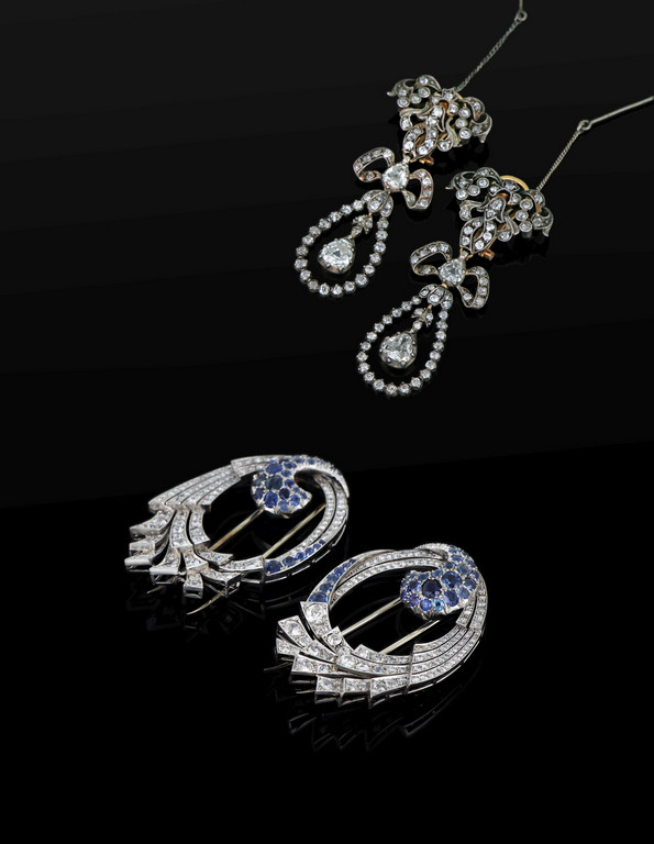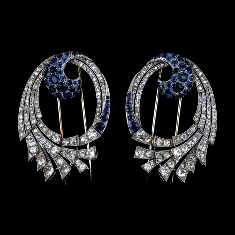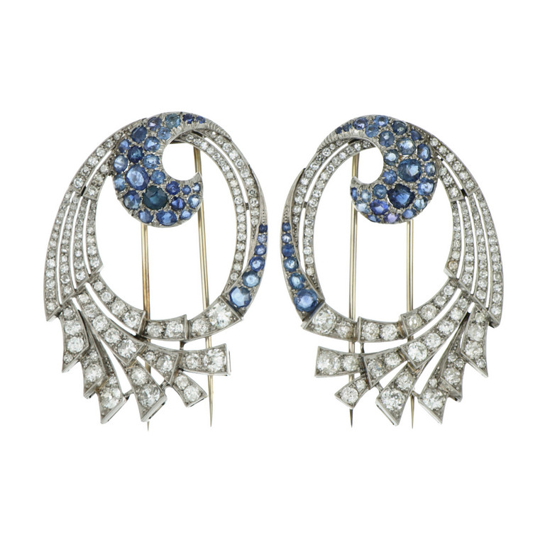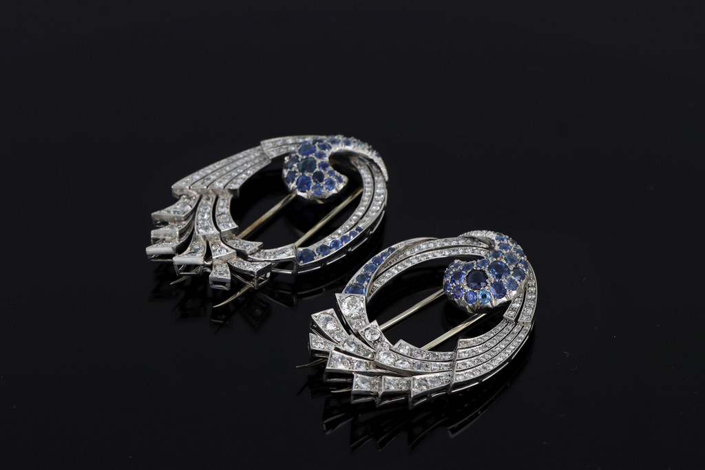 Platinum pair of brooch with sapphires and old-cut diamonds.