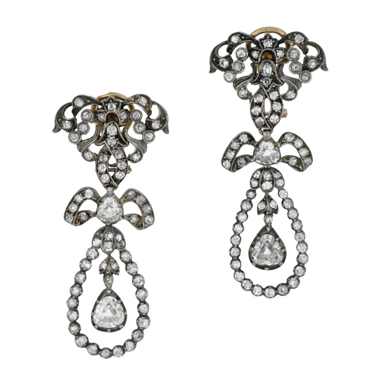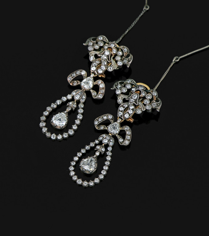 Eleganti e fini orecchini fine '800 in argento e oro al retro 4 diamanti a goccia di taglio antico per ct 2 50 ca. sono contornati da piccoli diamanti taglio rosa e vecchia miniera snodati e dotati di particolare sicura al lobo montano clips senza perno.