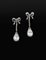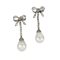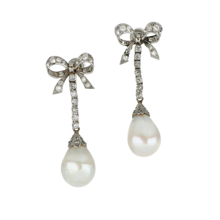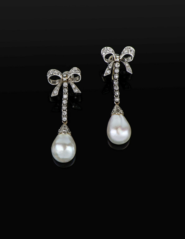 Orecchini in platino con una coppia di eleganti perle naturali a goccia di finissimo nacre realizzati a forma di fiocco e pendente con diamanti taglio antico.