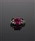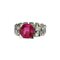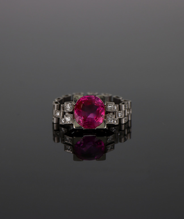 Anello probabilmente in platino a maglia con grande corindone colore hot-pink taglio cuscino di stimati ct. 6 5 la pietra esibisce caratteristiche tipiche della provenienza birmana (Mogok) e l' assenza di trattamento termico.