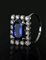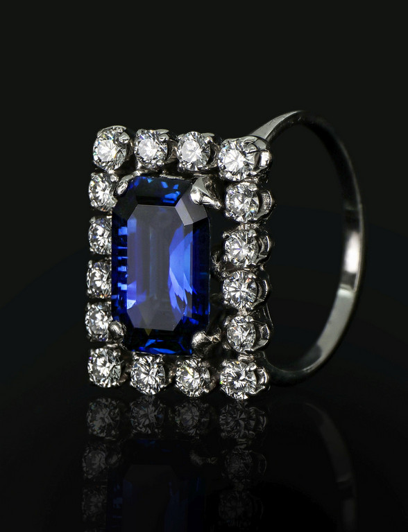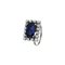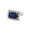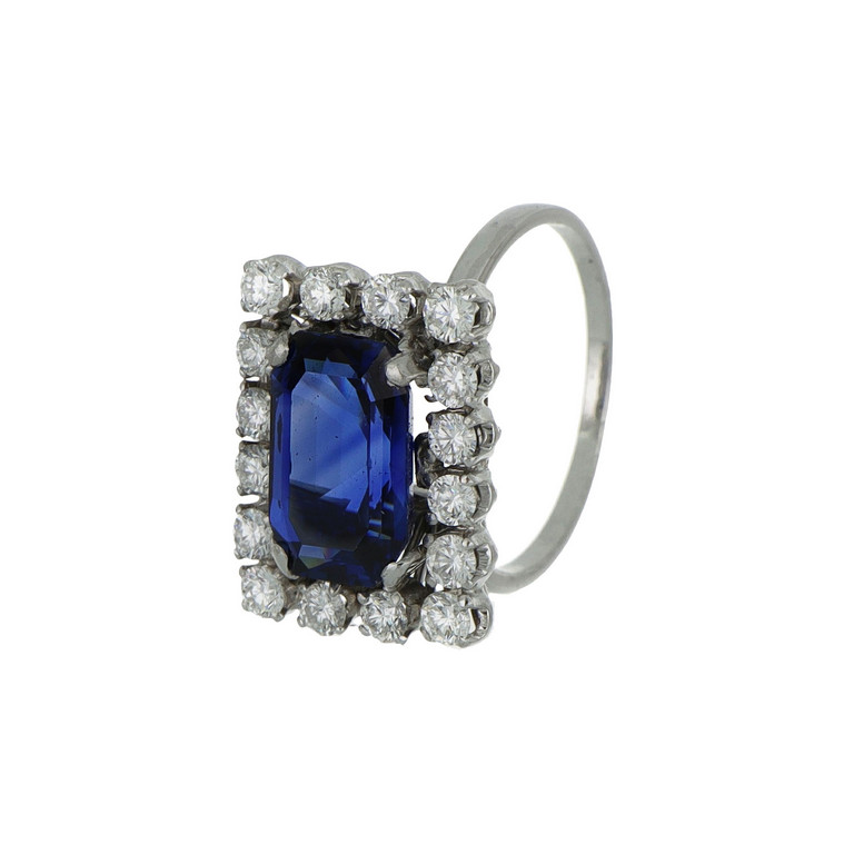 Anello in oro bianco di forma rettangolare diamanti taglio brillante a contorno al centro splendido zaffiro blu di ct 4 878 taglio smeraldo report gemmologico SSEF n.128381 attestante l'origine birmana e l'assenza di trattamento termico.