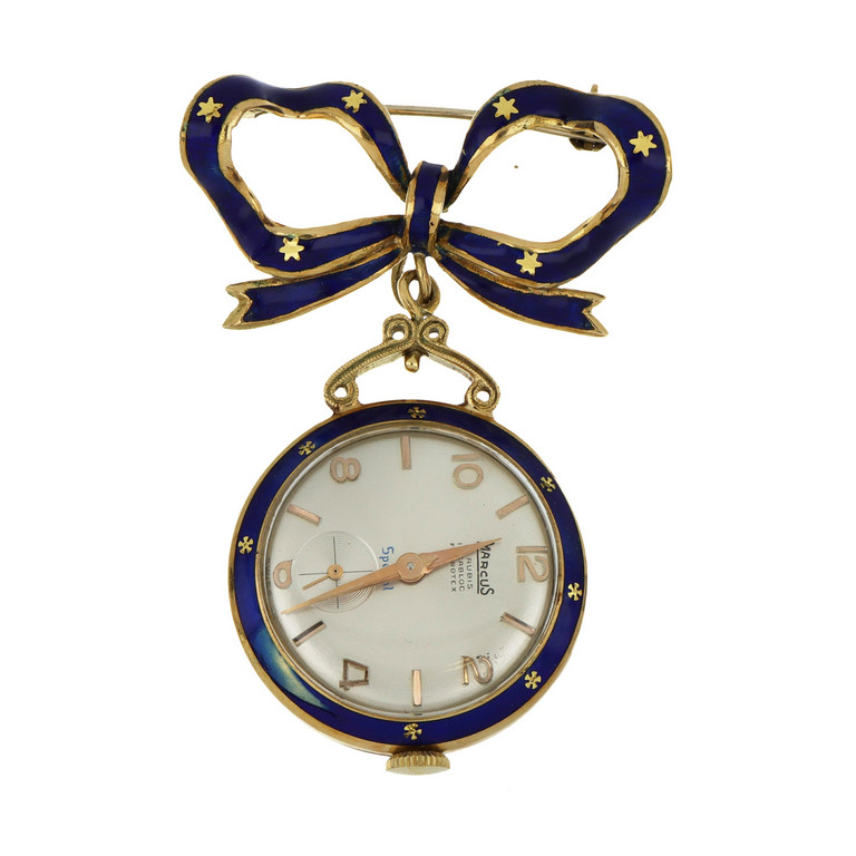 Marcus orologio da cappotto in oro giallo con smalti blu quadrante argenté con numeri arabi alternati a indici a bastone.
