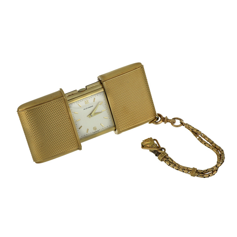 Movado orologio da viaggio in oro giallo e chatlen parte mancante perfette condizioni di conservazione movimento meccanico a carica manuale collegato all'apertura dell'astuccio.