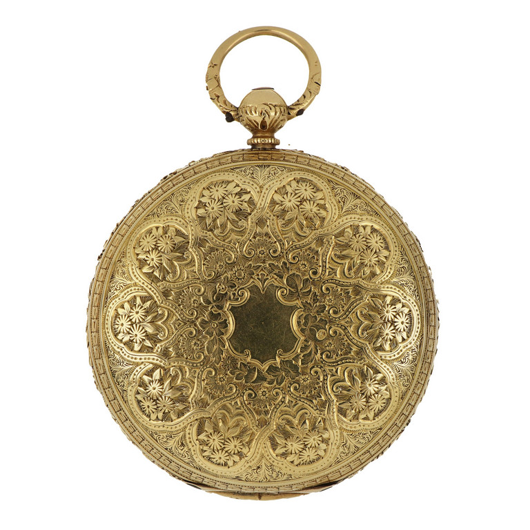 Anonimo orologio da tasca epoca 1800 in oro giallo tripla cassa finemente inciso e decorato a fiori e rosette animato da movimento meccanico carica a chiavetta quadrante in argento con bassorilievo a cestino in oro numeri romani e dot per i minuti secondi a ore 6.