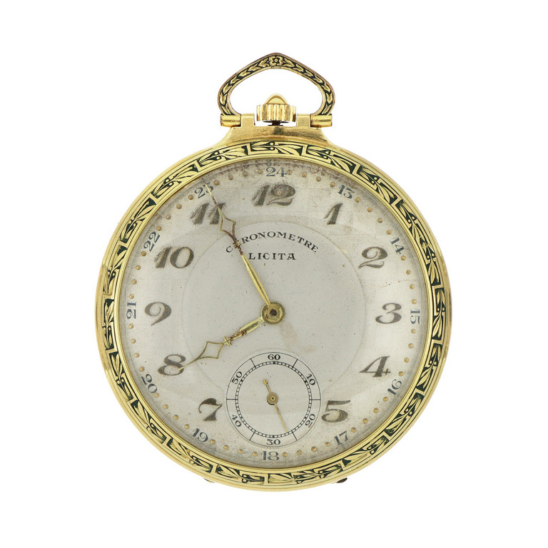 Licita orologio da tasca in oro giallo doppia cassa con quadrante crema opaco numeri arabi e piccoli secondi al 6.
