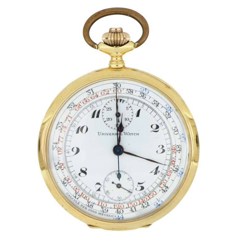 Universal Watch splendido orologio cronometro da tasca in oro giallo doppia cassa ottime condizioni di conservazione quadrante bianco in smalto lucido e dipinto a mano spirale tachimetrica periferica piccoli secondi a ore 6 contatore dei minuti cronografici alle 12.