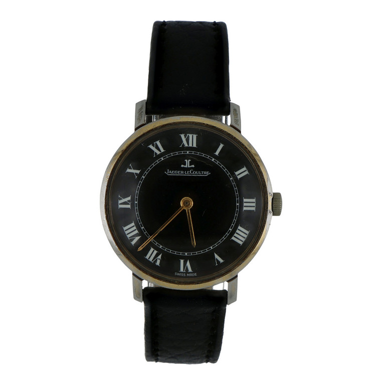 Jaeger le Coultre orologio da uomo in acciaio animato da movimento meccanico a carica manuale quadrante nero sfere a bastone numeri romani.