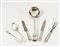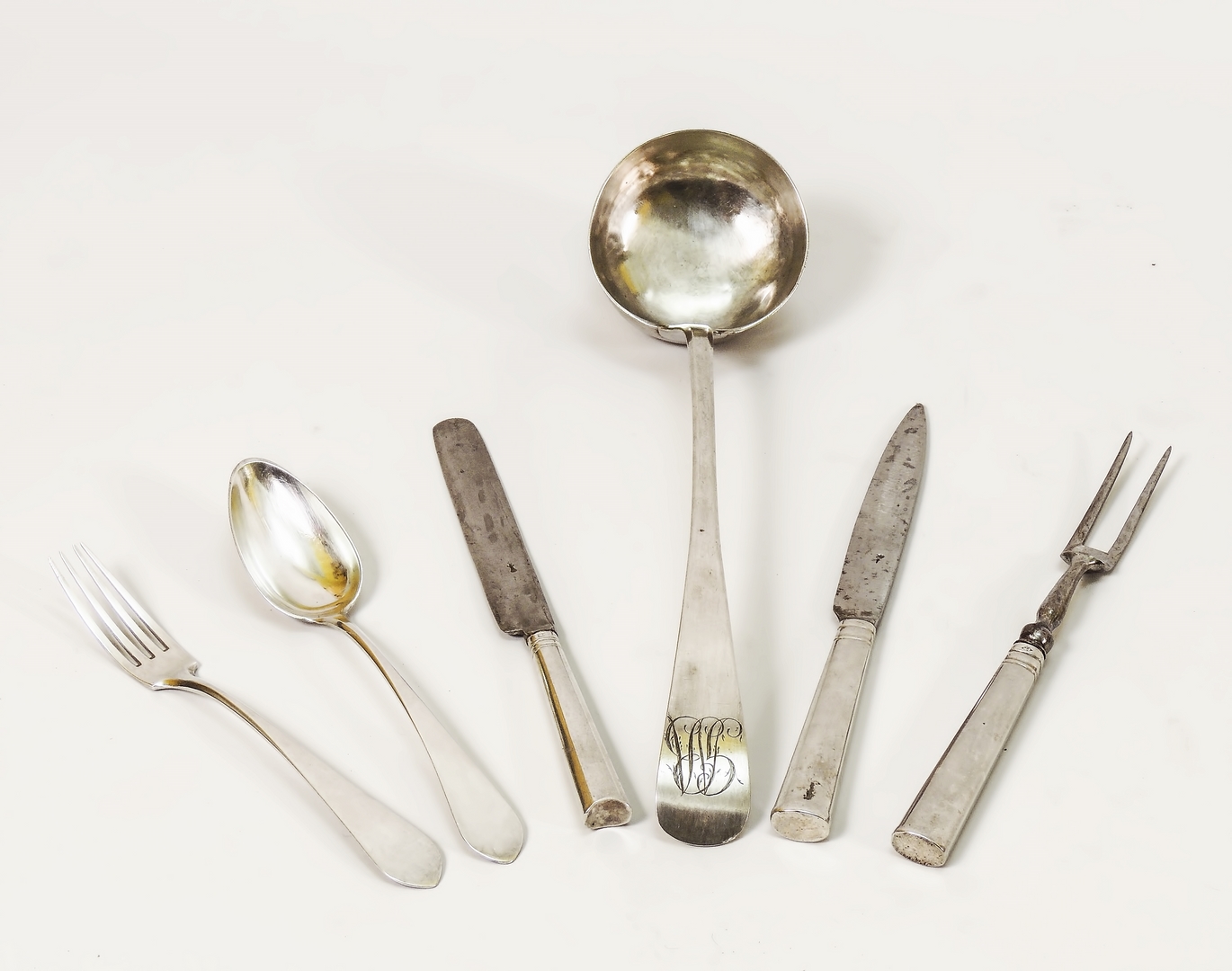 SERVITO DI POSATE IN ARGENTO - SILVER CUTLERY SET XIX secolo - 19th Century composto da 16 cucchiai, 27 forchette, 12 coltelli, ramaiolo e due posate da portata, alcune differenze (58) gr complessivi 2635 esclusi i coltelli