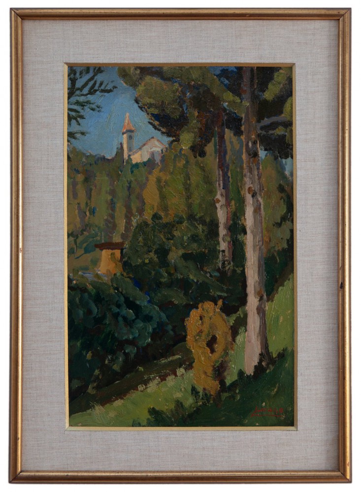 LUIGI ZAGO VILLAFRANCA DI VERONA 1894 - MENDOZA 1952 La chiesetta Olio su cartone cm 39,5 x 24