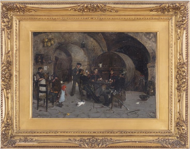 NAZARENO ORLANDI ASCOLI PICENO 1861 - BUENOS AIRES 1952 Soldati all'osteria Olio su tela cm 32 x 46,5