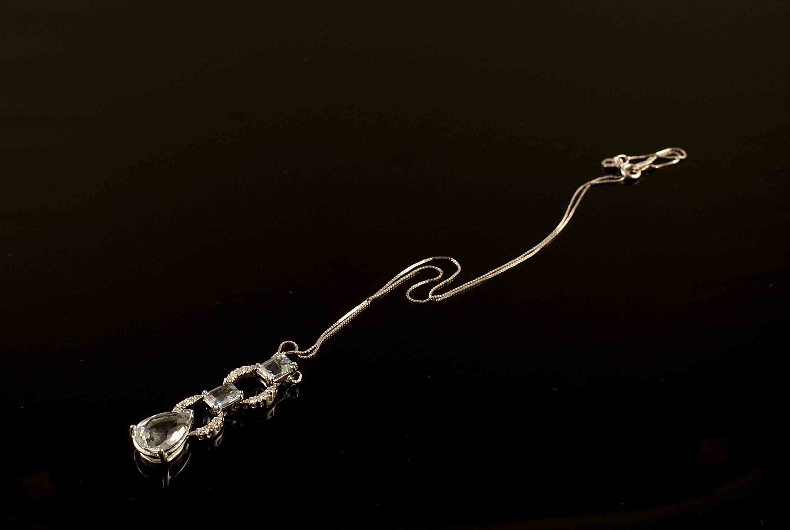 Pendente in oro bianco 18kt con incastonate tre acquamarine di diverso taglio per carati 6 circa e diamanti taglio brillante per 0,20 punti circa, gr. 6,3.
