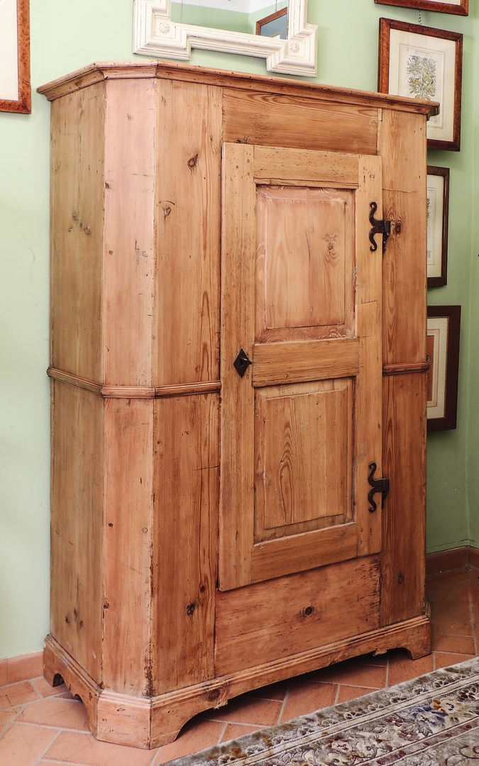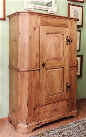 PICCOLO ARMADIO RUSTICO IN LEGNO TENERO - SMALL SOFT WOOD WARDROBE cappello modanato, angoli scantonati, uno sportello con formelle in rilievo sul fronte, piedi a mensola h cm 198x129x54