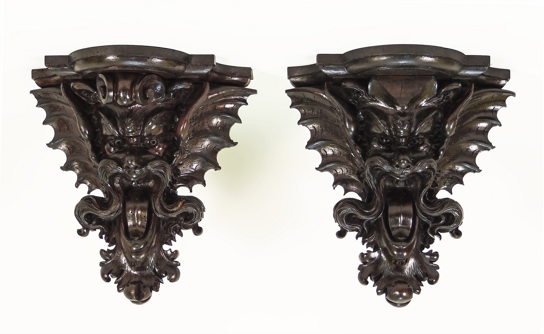 COPPIA DI MENSOLE IN NOCE - PAIR OF WALNUT SHELVES intagliate con mascheroni h cm 32,5