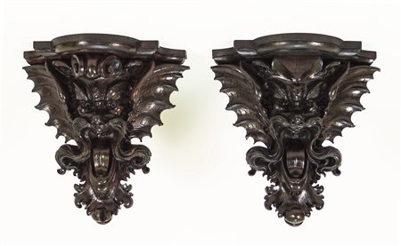 COPPIA DI MENSOLE IN NOCE - PAIR OF WALNUT SHELVES intagliate con mascheroni...