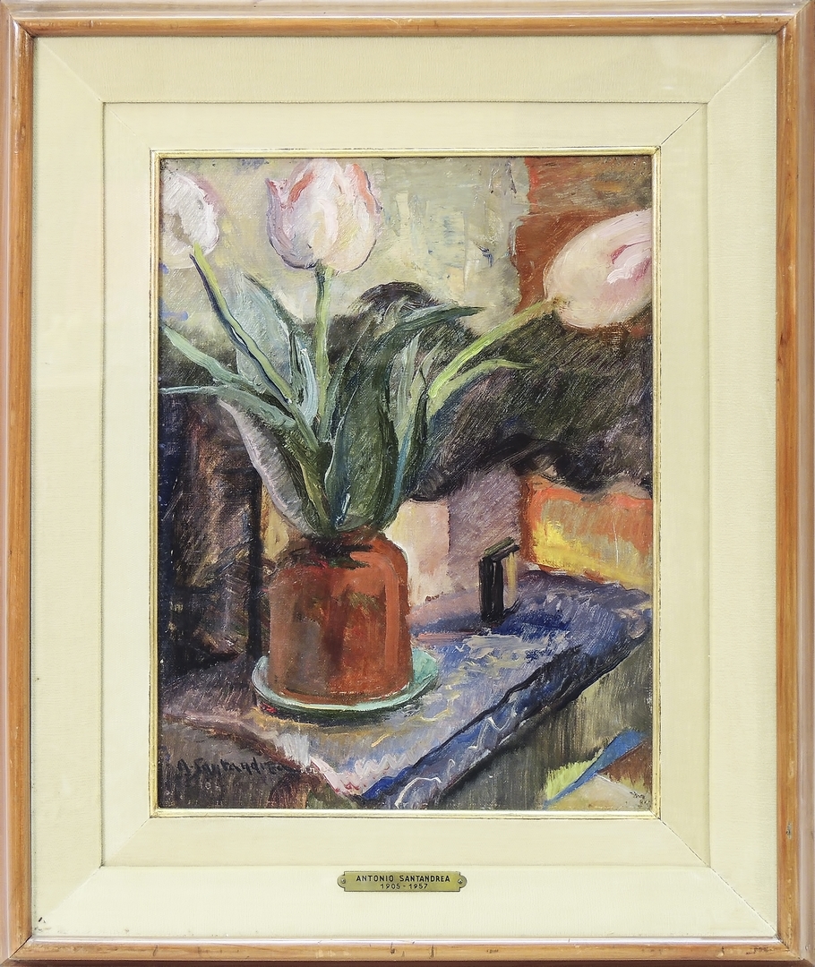 ANTONIO SANTANDREA Vaso con fiori - Flowers in a Vase olio su tela - oil on canvas, firmato, al verso firmato e datato 1949, in cornice cm 40x30