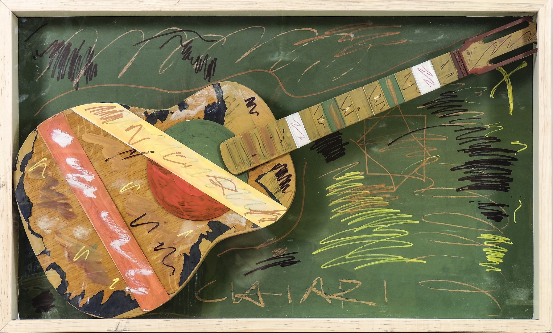 GIUSEPPE CHIARI (1926-2007) Composizione con chitarra - Composition with Guitar strumento musicale e tecnica mista - musical instrument and mixed media, firmato, entro cornice a teca cm 50x90 Corredato di autentica dell'autore su fotografia - With Author's authentication on photo