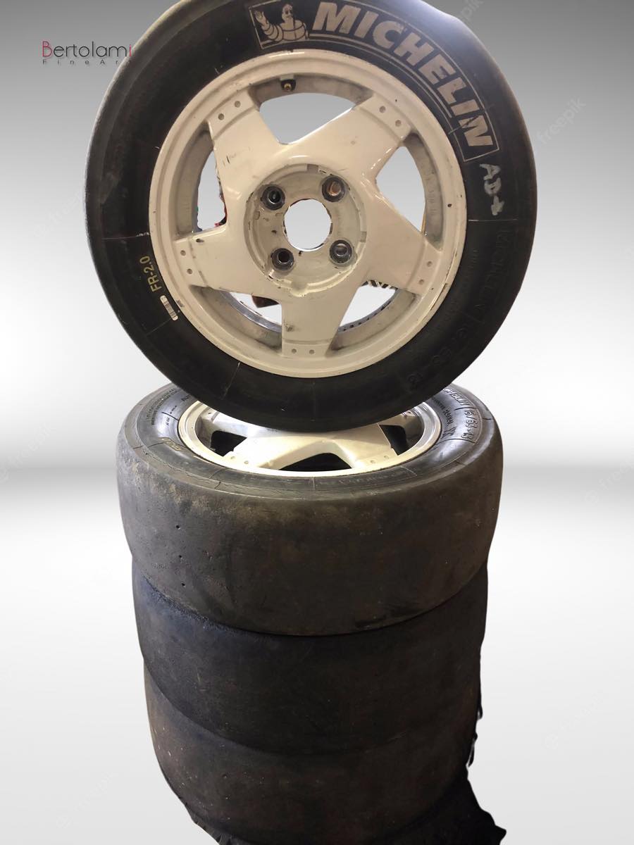 4 cerchi gommati a cinque razze con pneumatici slick da corsa ovviamente da sostituire per DOT vecchio