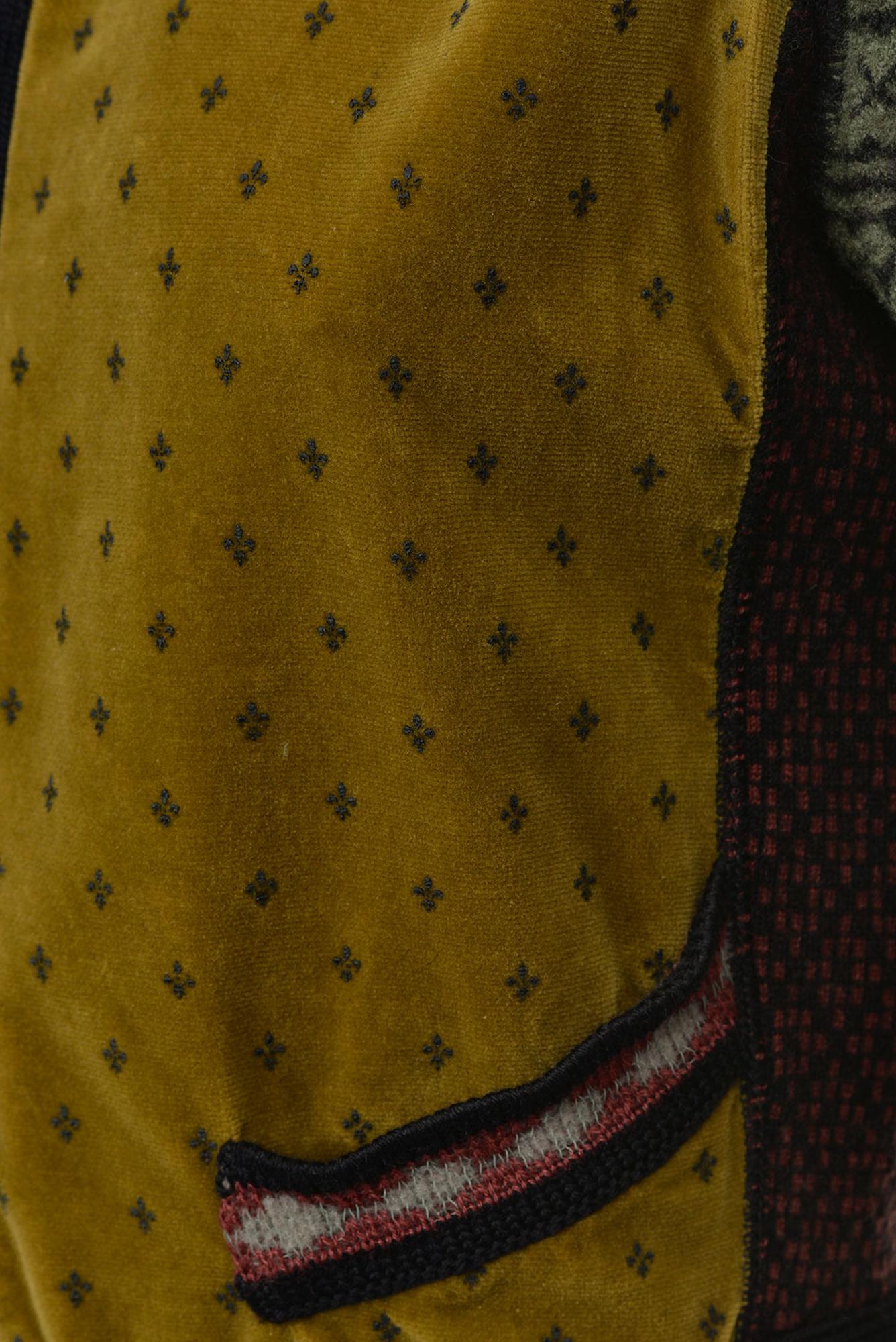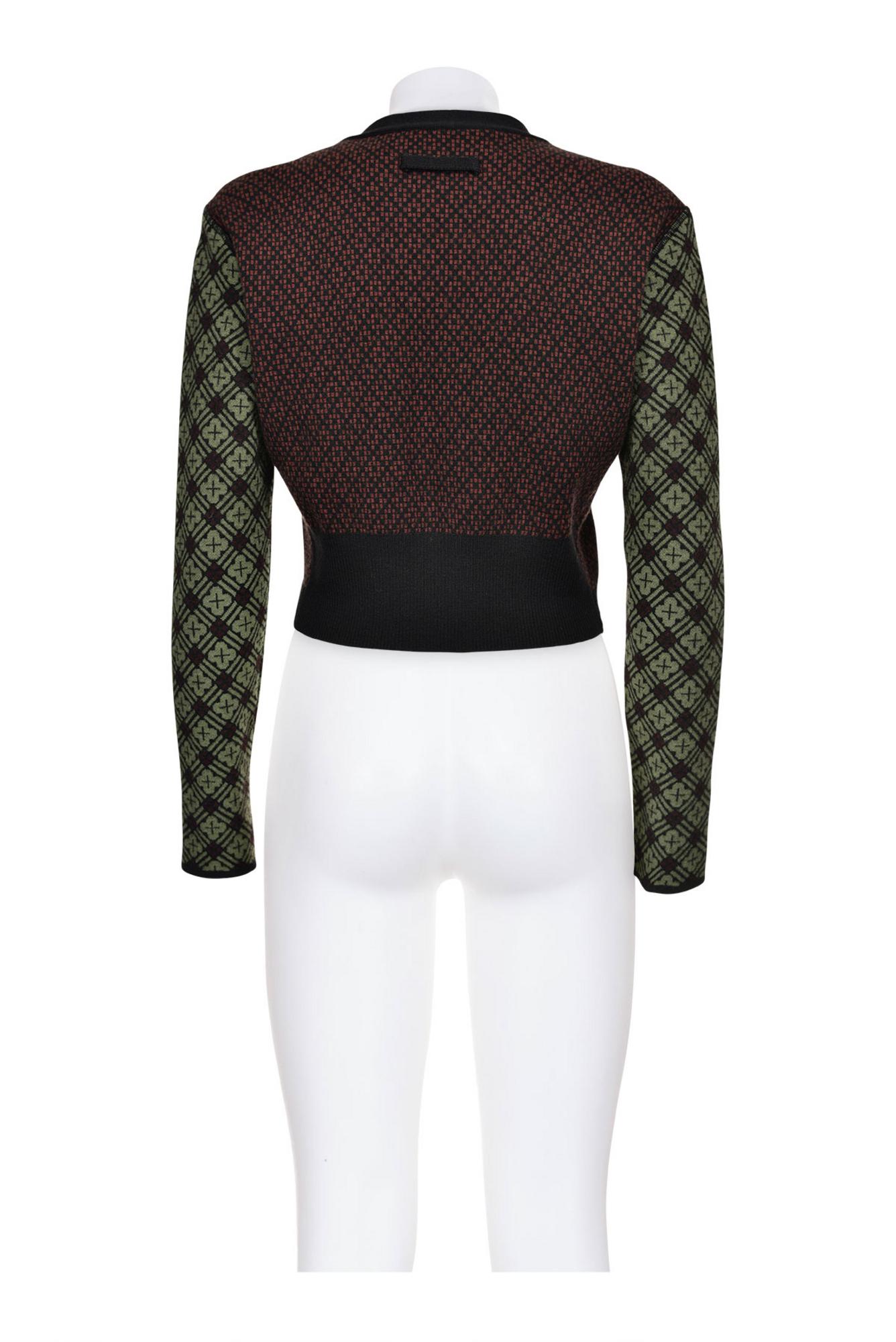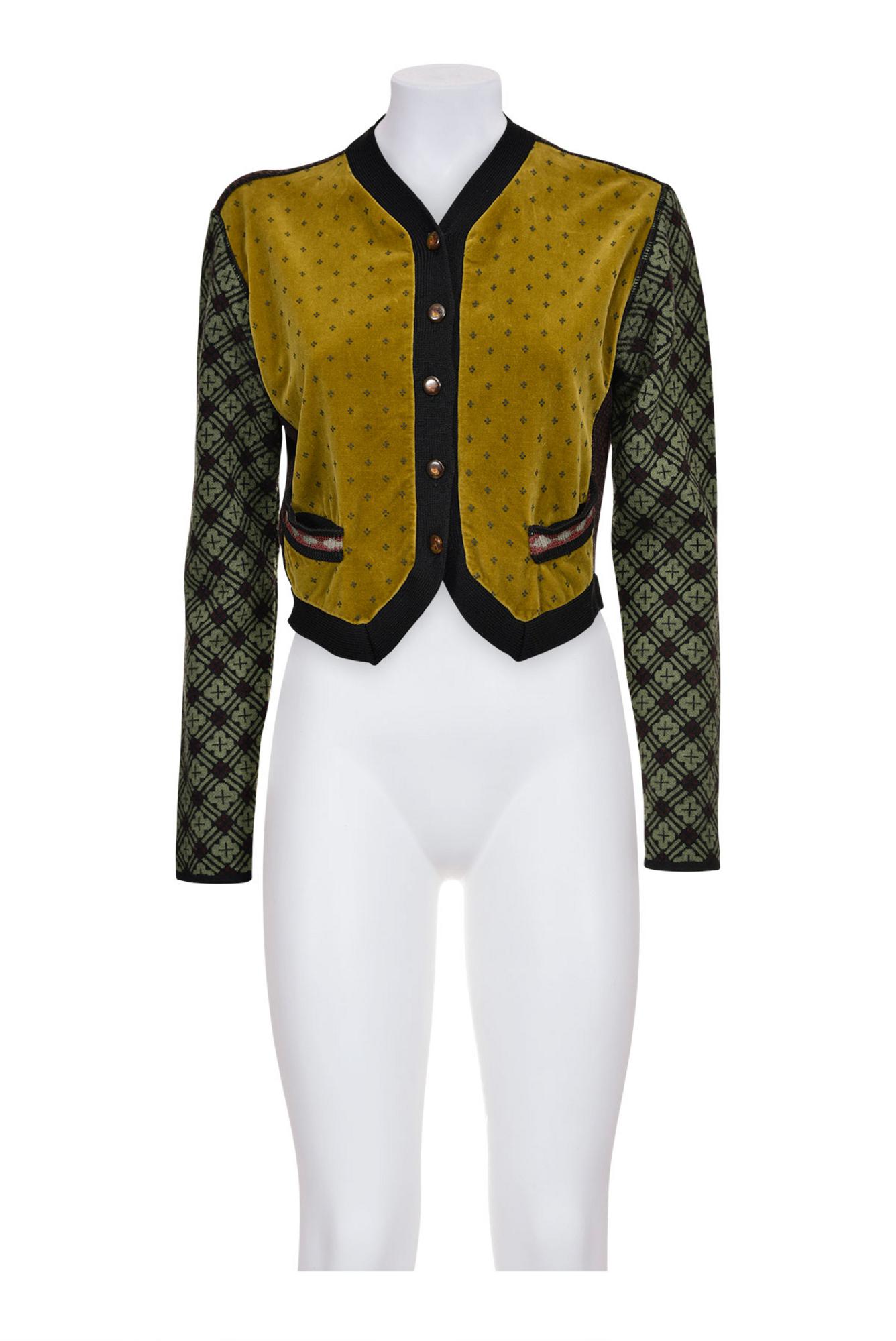 Multicolor green, brown and black jacquard mini cardigan with olive green velvet front from the 90's