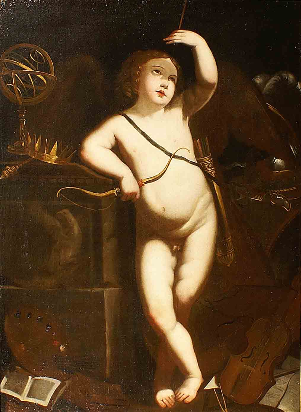 Scuola romana del primo quarto del XVII secolo, "Eros con i simboli delle arti e delle scienze", olio su tela, cm. 130x96.