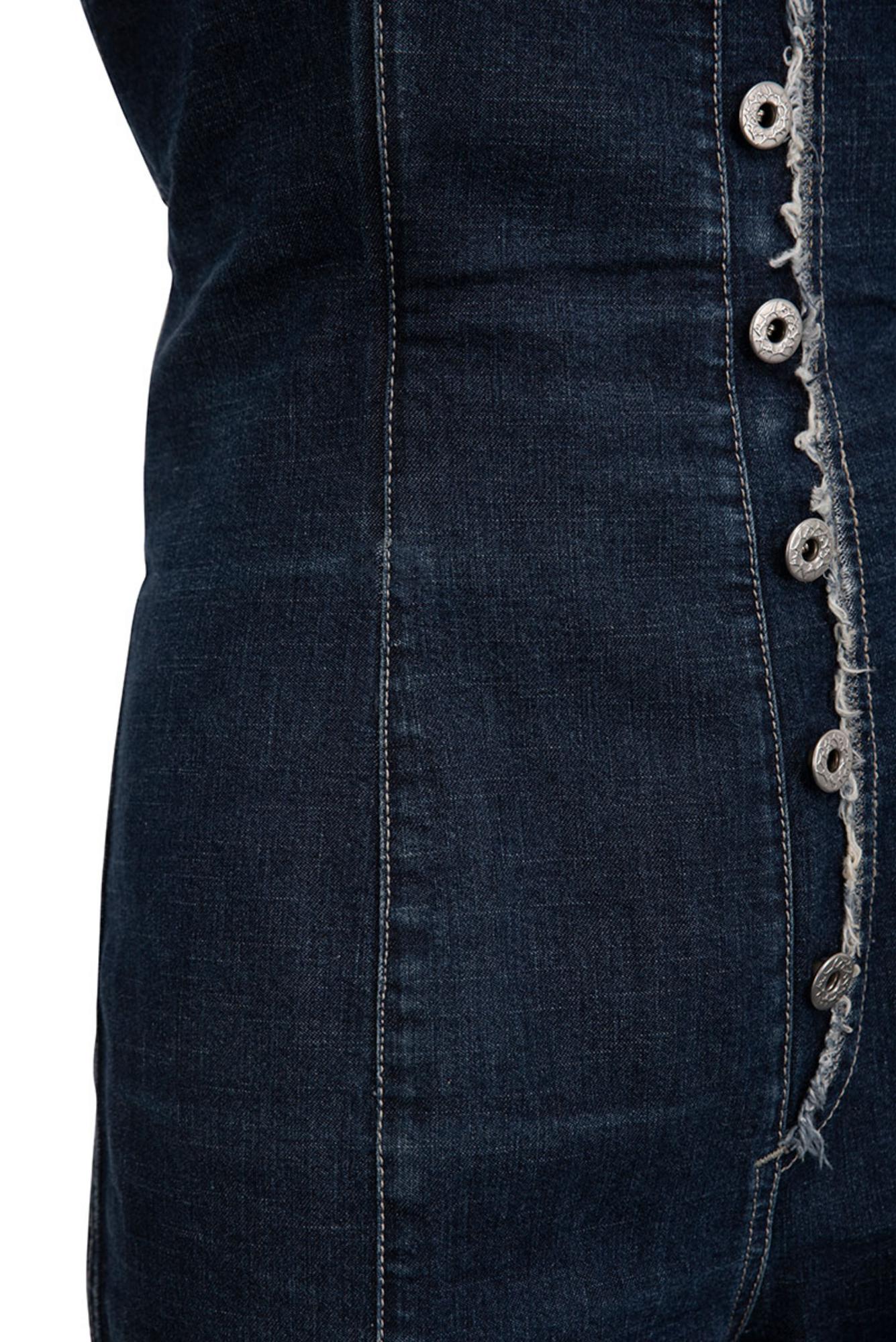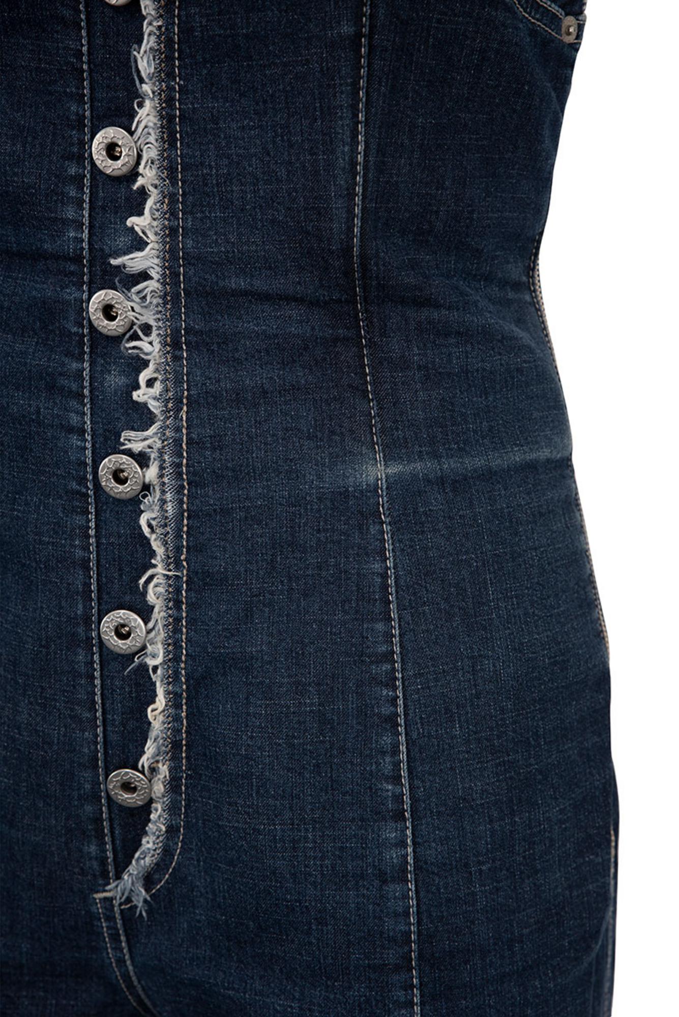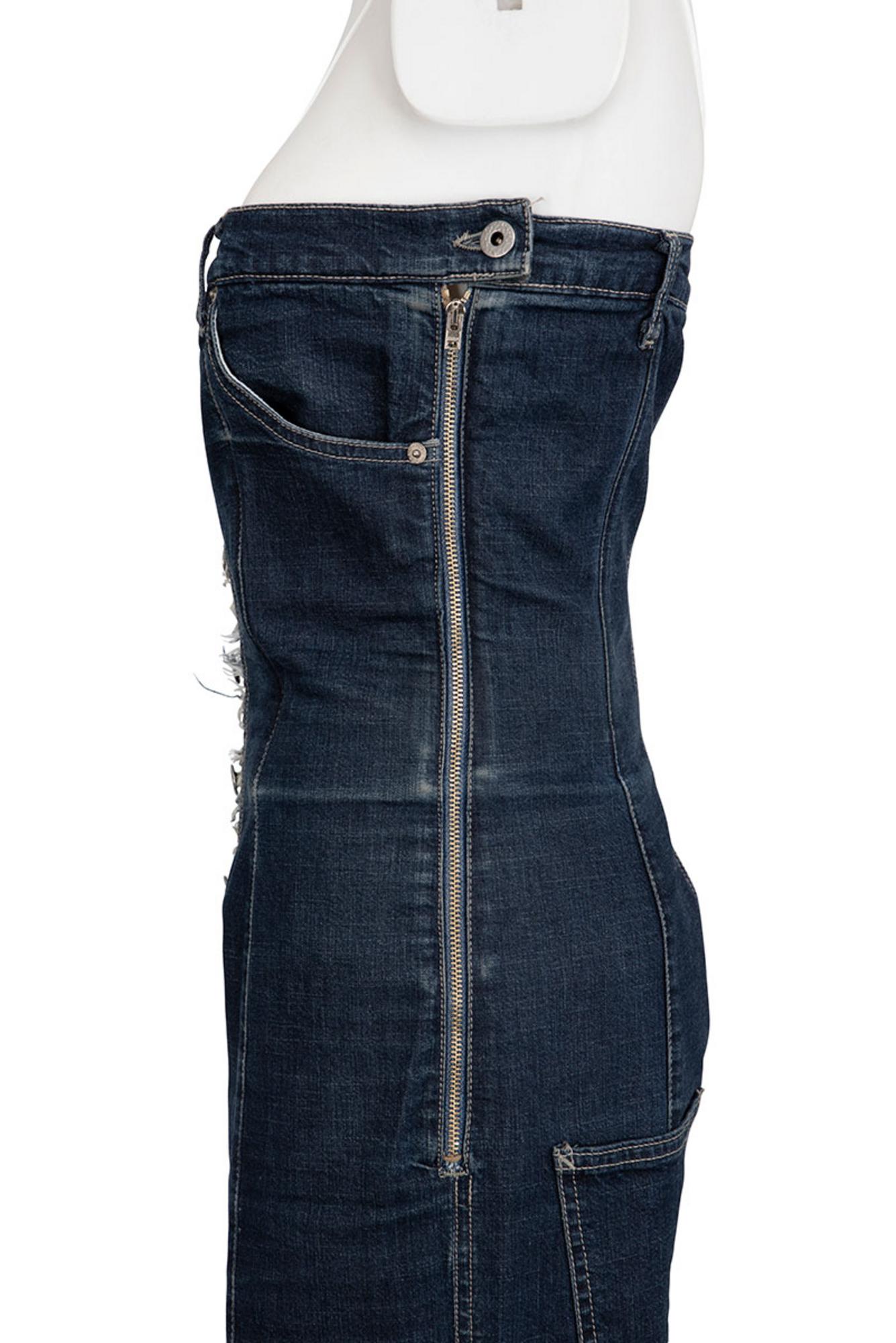 Rare and iconic denim bustier jumpsuit with raw hems and metallic buttons from the 90's
