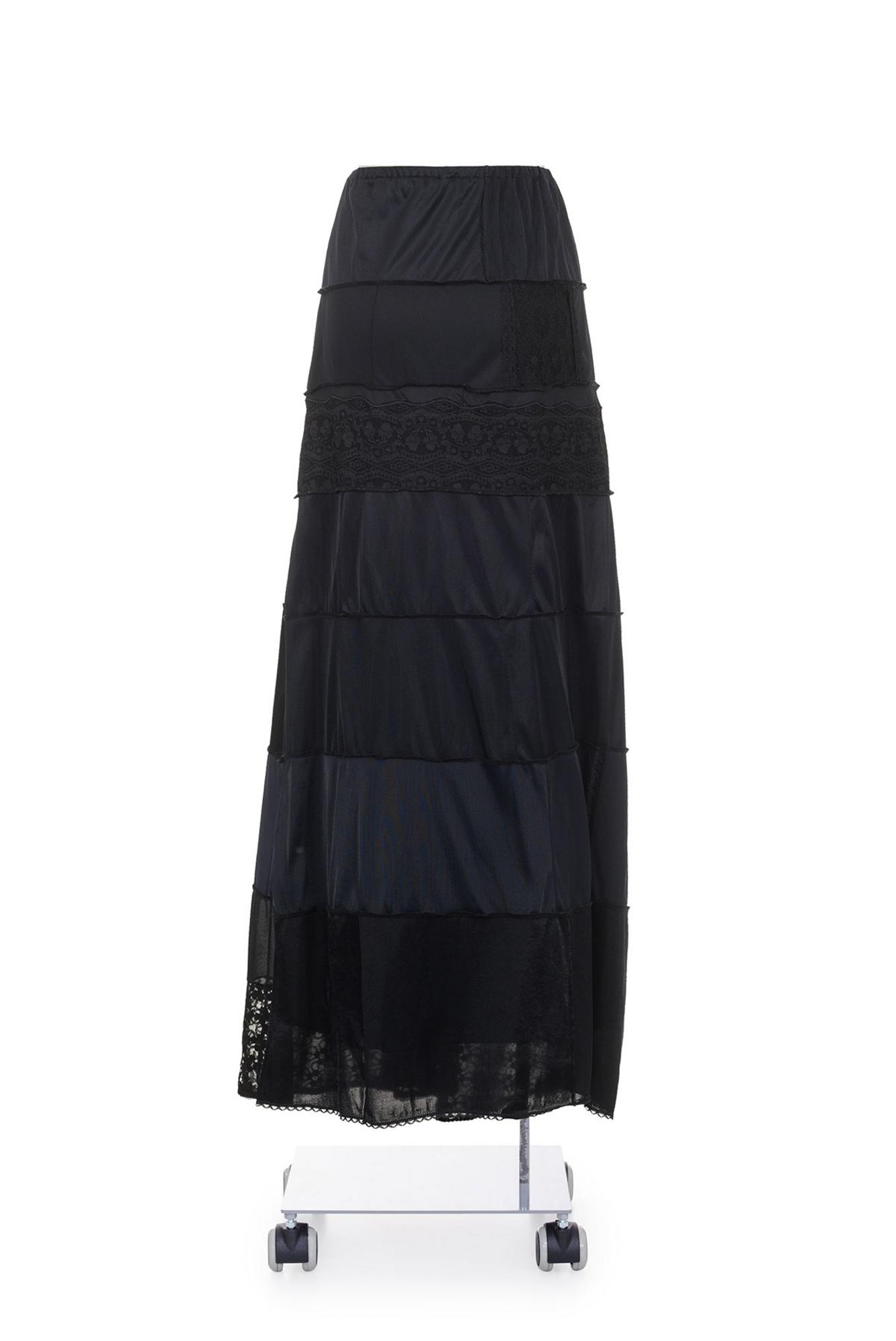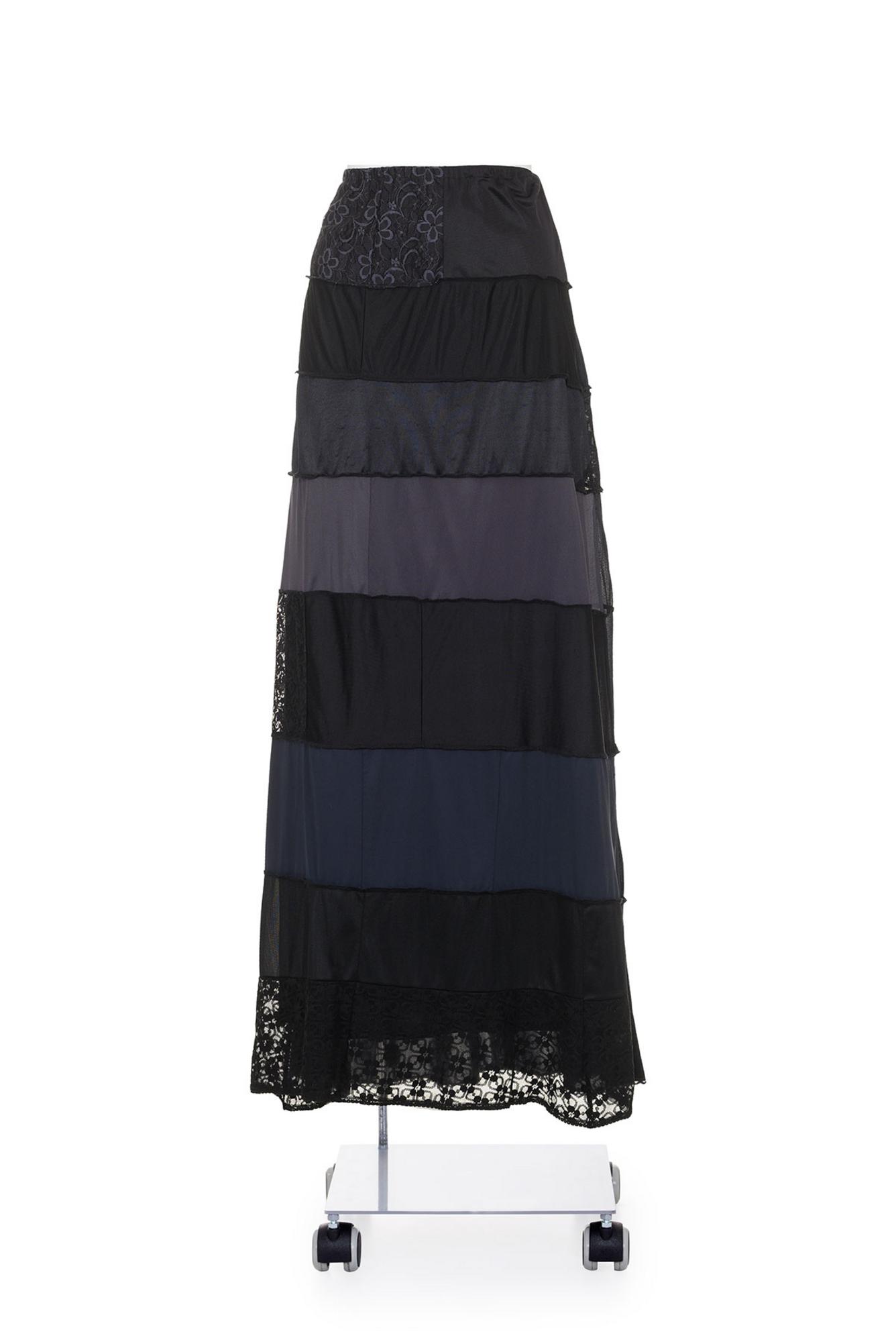 Artisanal long skirt from SS 03 collection, realized with a patchwork of vintage lingerie items, some lace inserts, visible stitchings.