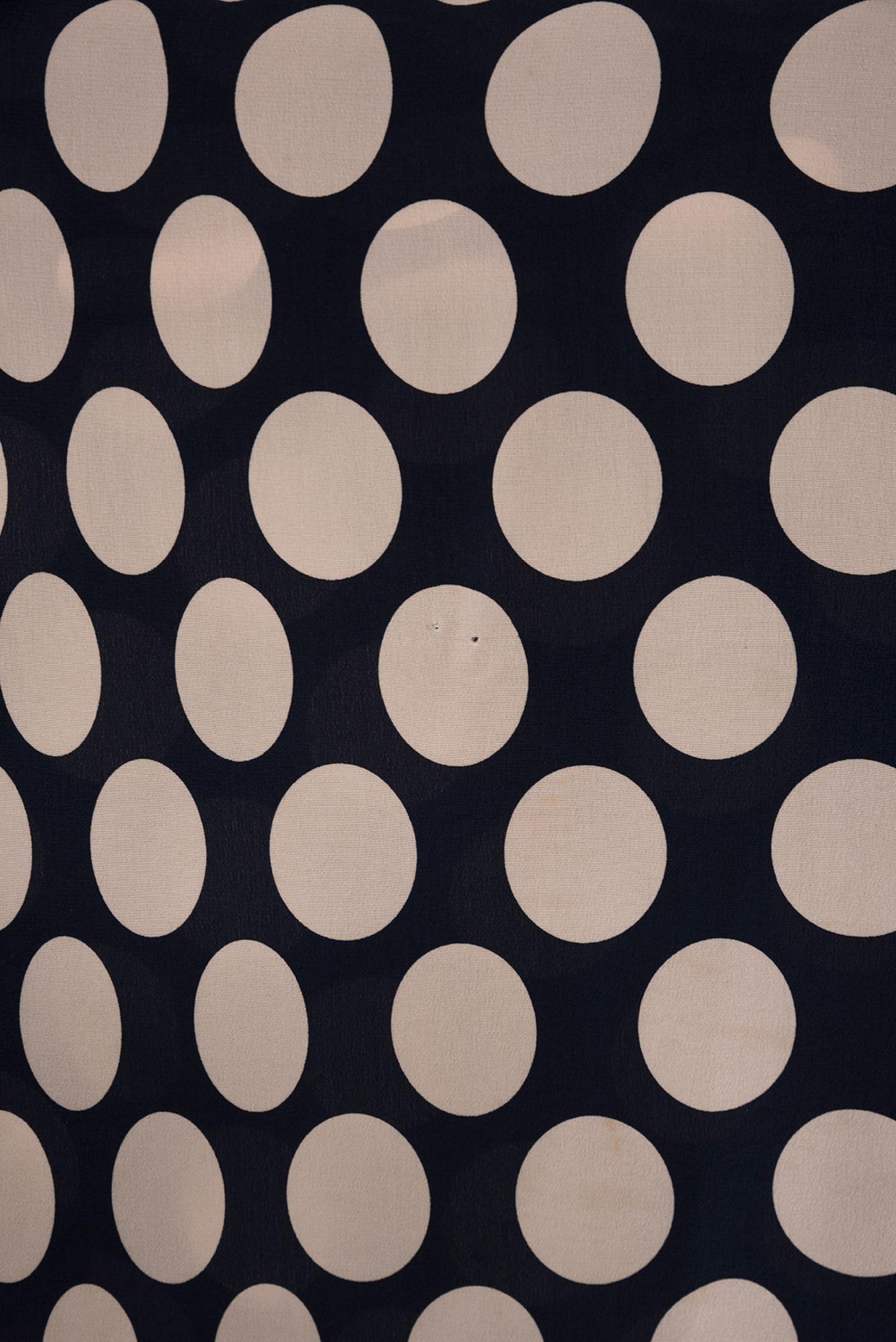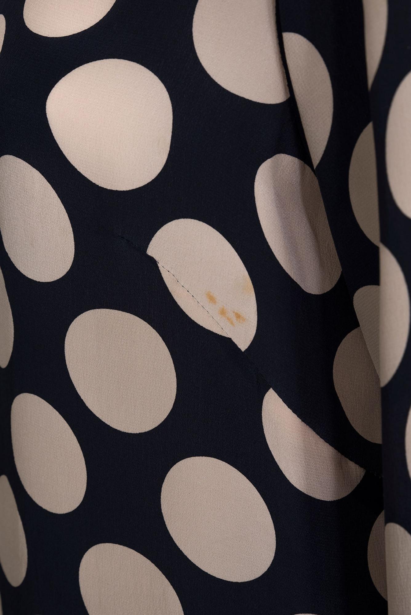 Raro abito chemisier lungo blu navy e beige a pois con strascico regolabile laterale della collezione PE 06