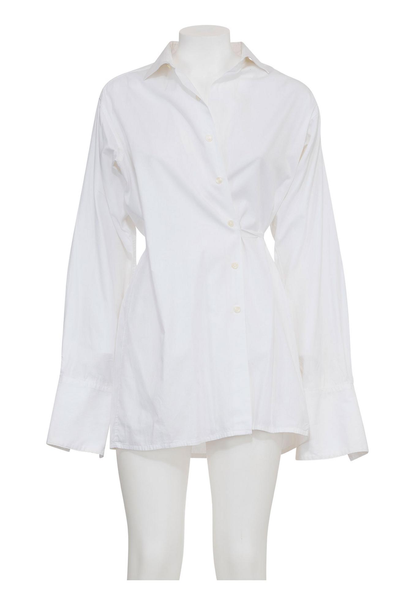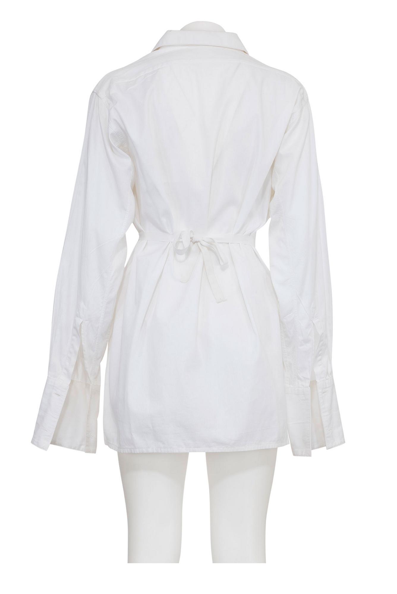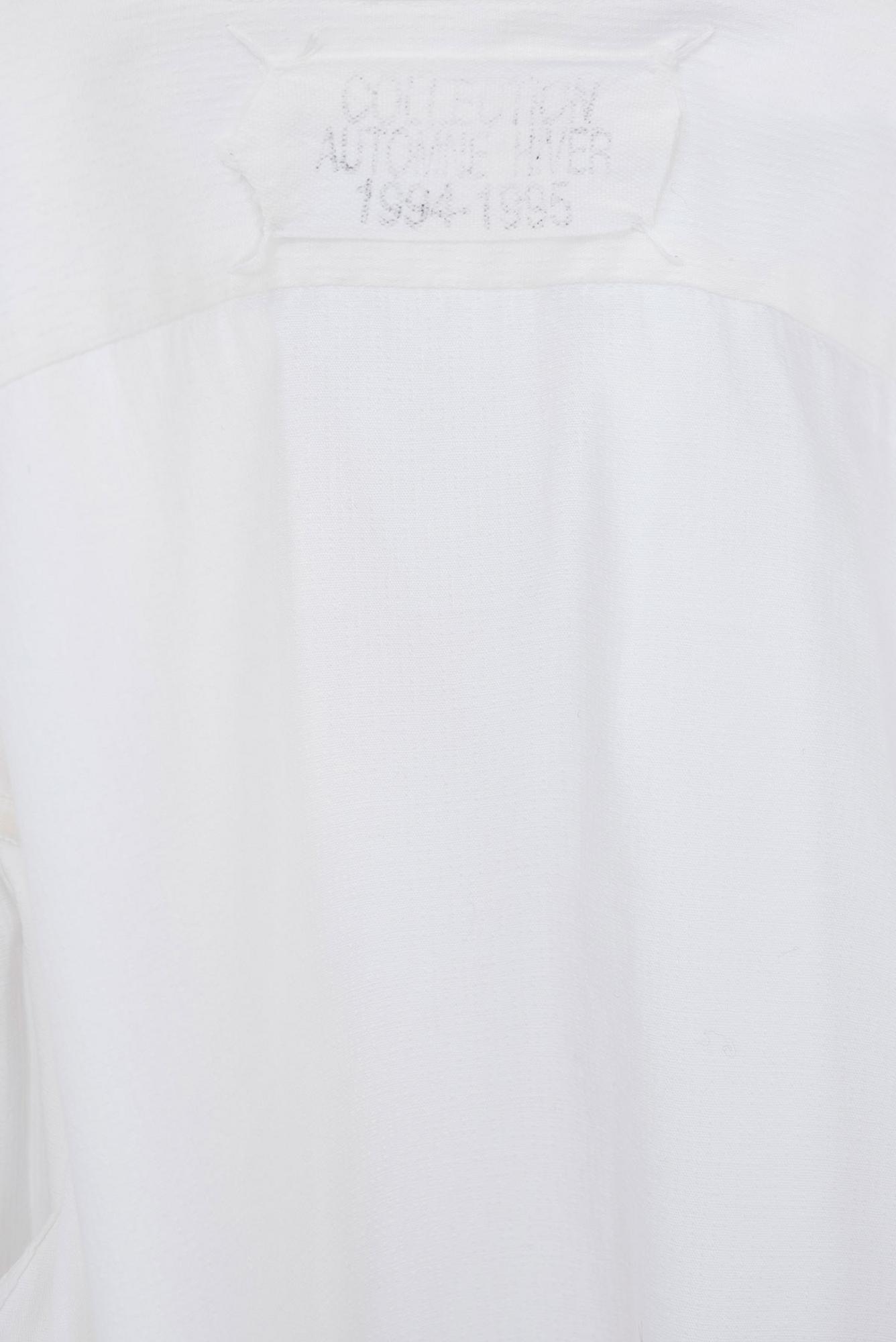 Iconica e rara camicia bianca fasciata artigianalmente con stringhe ricavata da una camicia da uomo della collezione PE 95