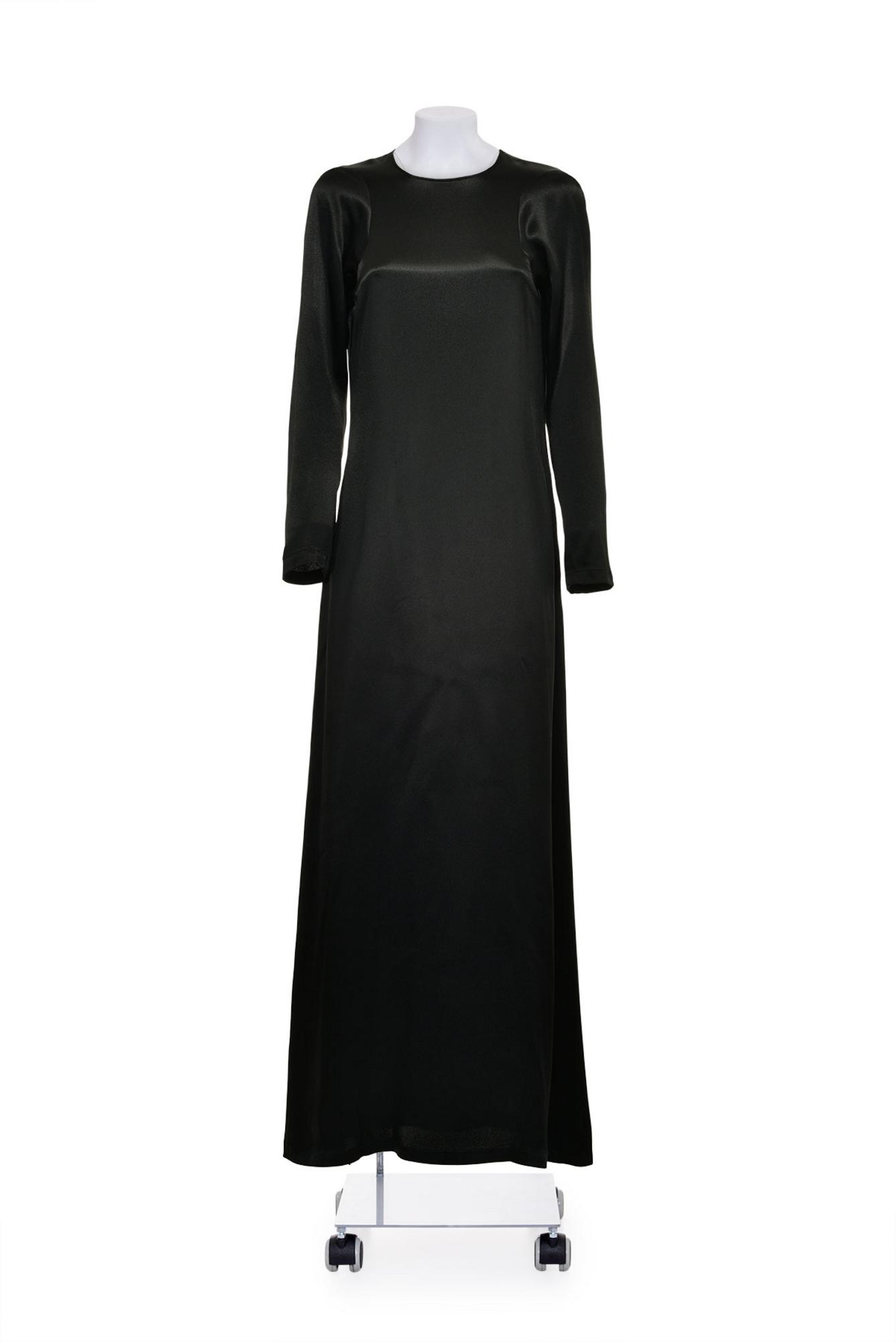 Long black satin flared dress with long sleeves from SS 98 collection