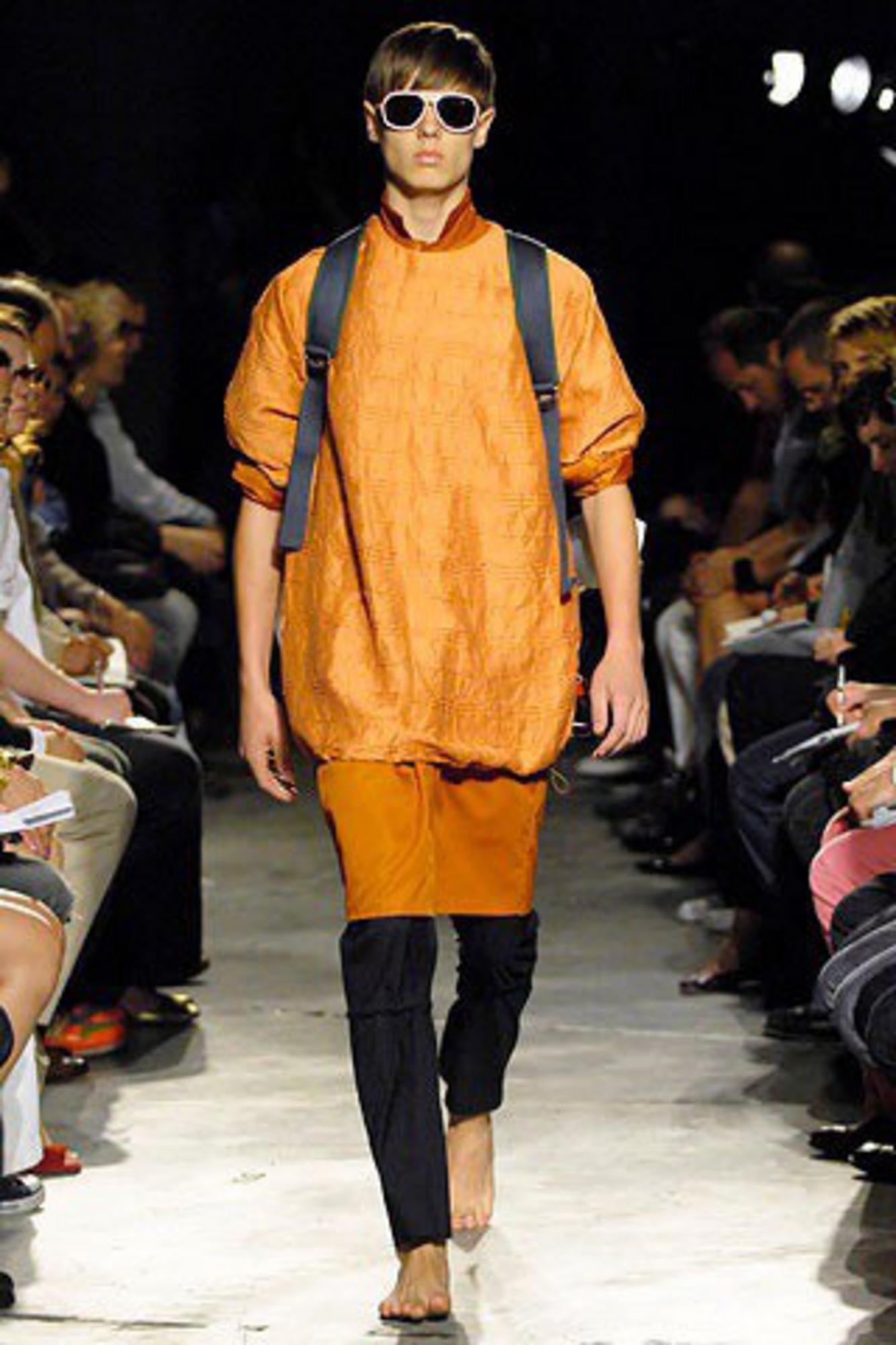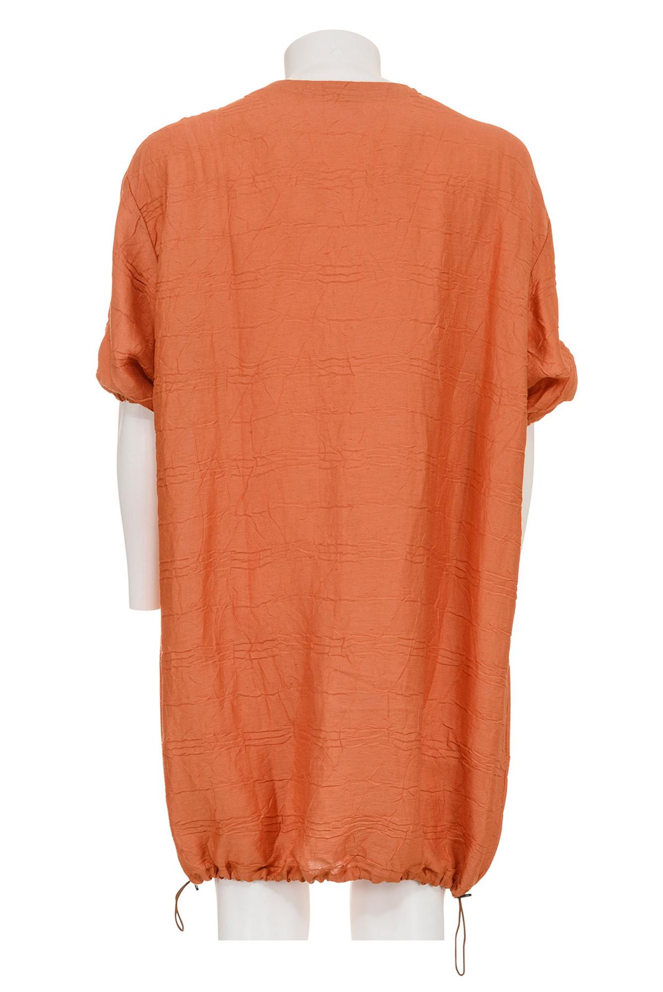 Crinkled orange tunic with elasticated strings at hems and velcro strap at neckline from SS 08 collection