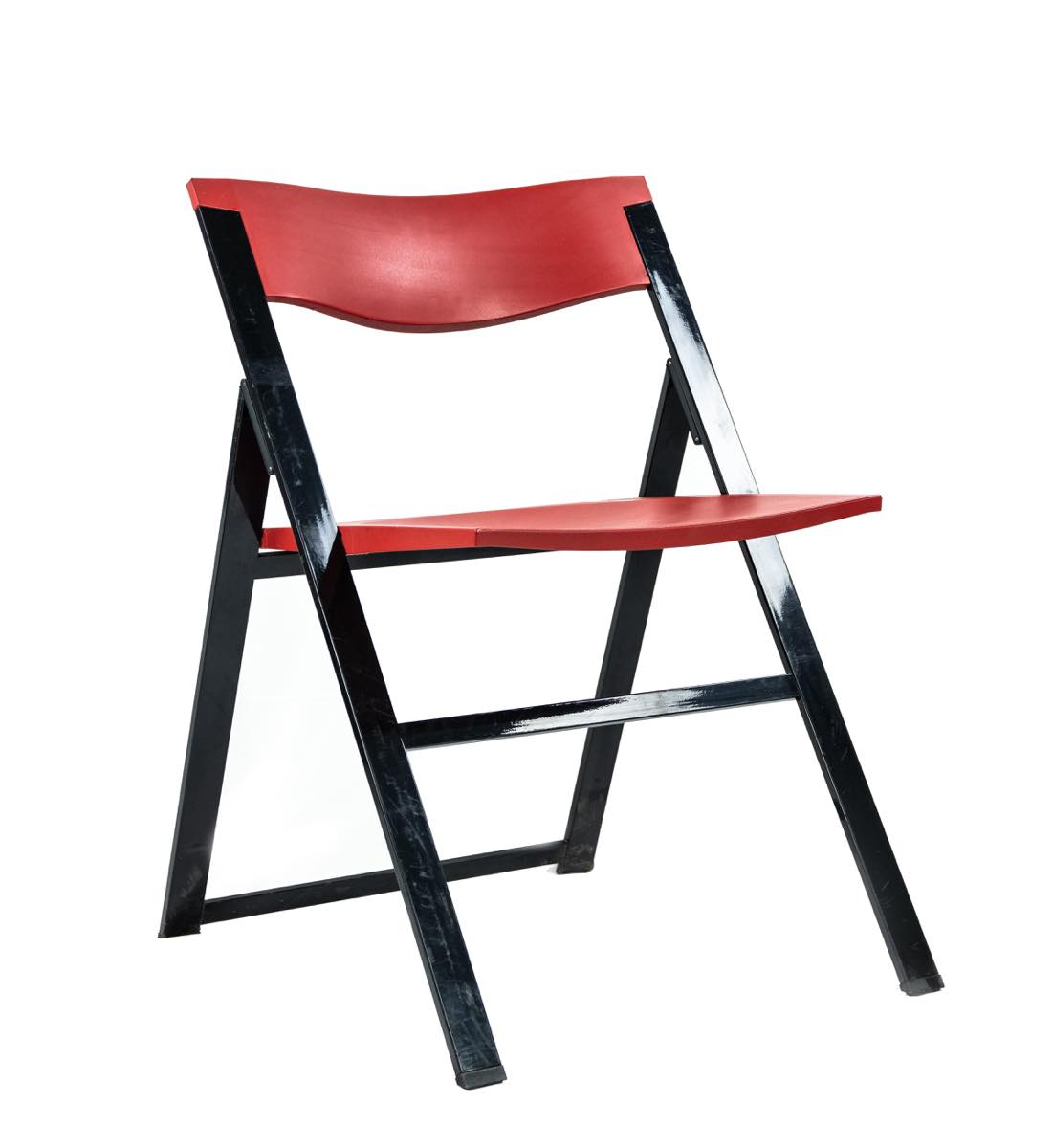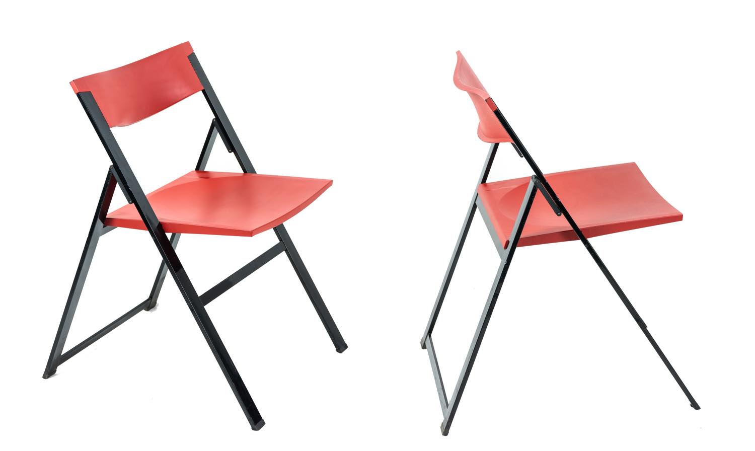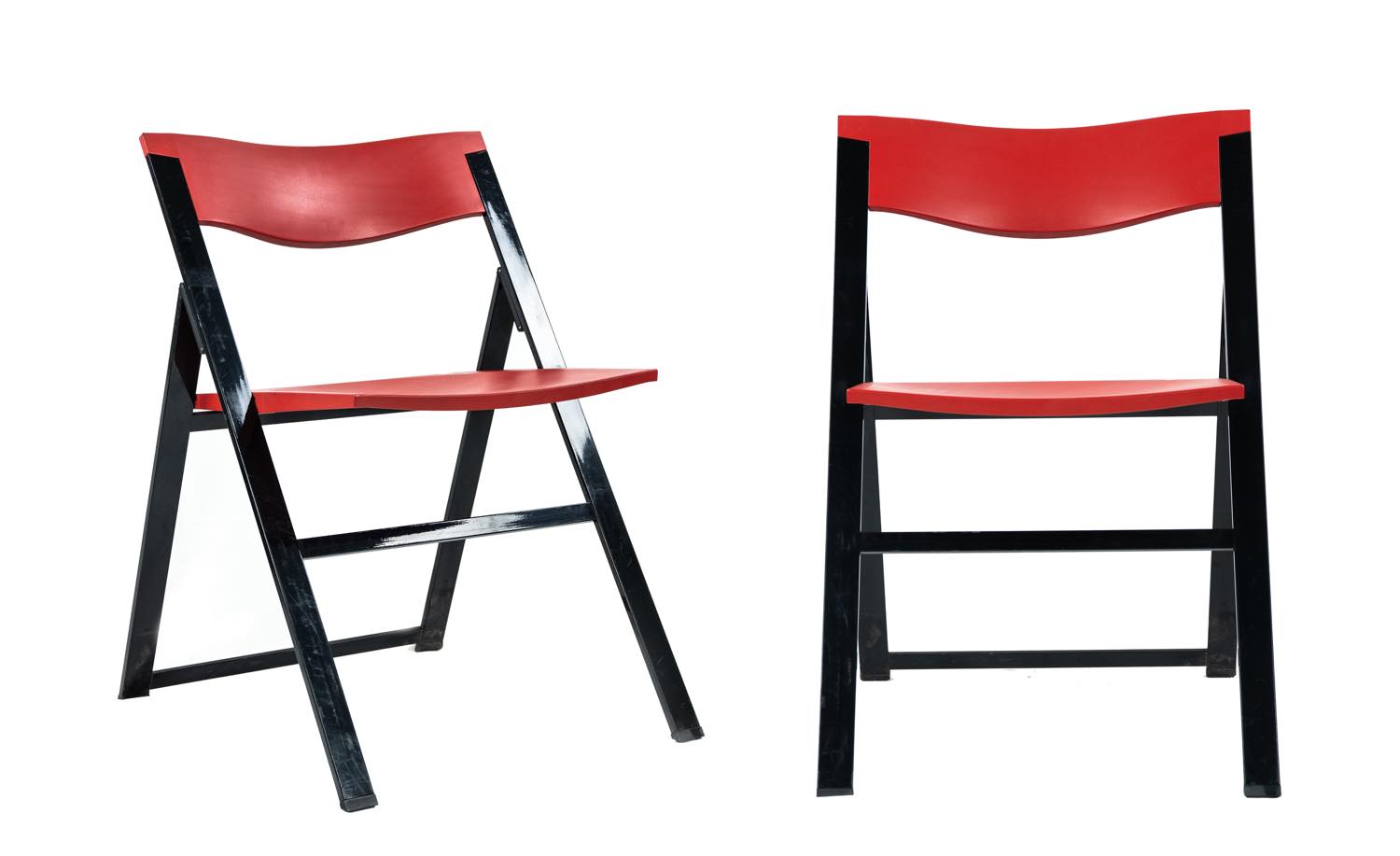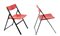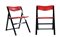 Coppia di sedie pieghevoli rosse e nere. La seduta e lo schienale sono in nylon verniciato di rosso.